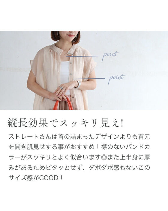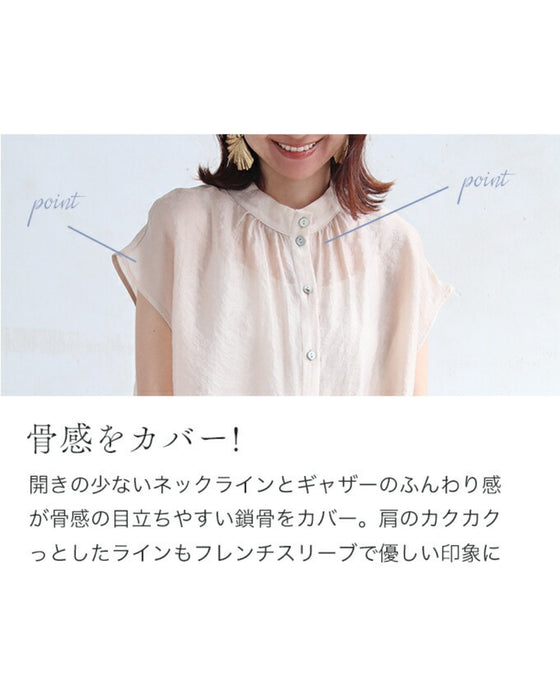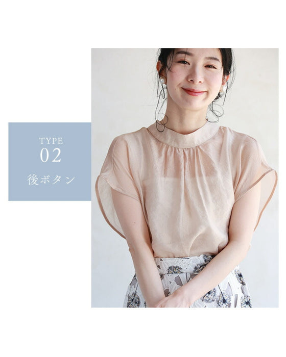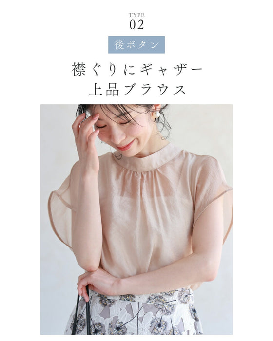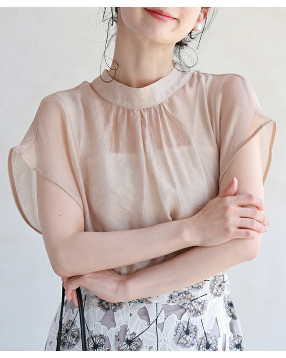 ネックが詰まったデザインもシアー素材で抜け感が生まれる。立体的なふんわりギャザーが柔らかで上品な印象に。