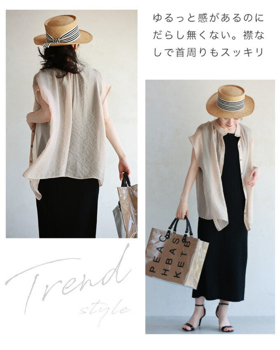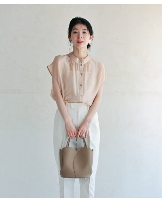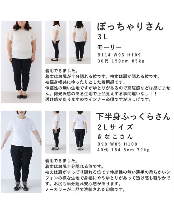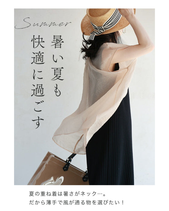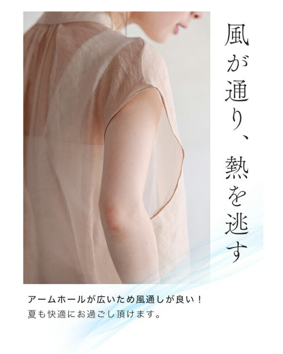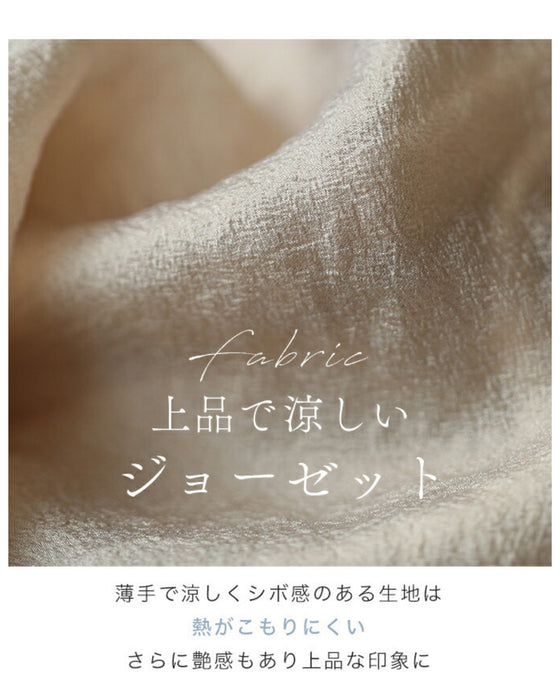 上品で涼しいジョーゼット素材は薄手で涼しくシボ感のある生地は熱がこもりにくい。さらに艶感もあり上品な印象に。アームホールが広い為風通しが良く、夏も快適にお過ごし頂けます。