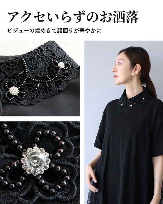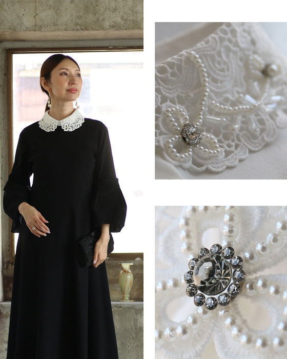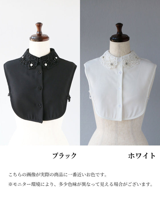 このジュエリーライクな付け襟は、シンプルな装いに華やかさを添え、顔回りを引き立てます。