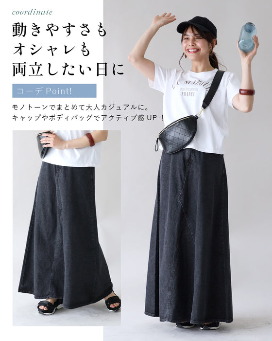 「ロゴT×ブラックデニムスカートコーデ」