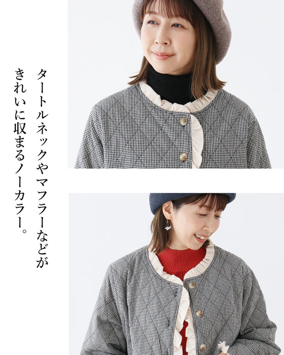 タートルネックやマフラーなどがきれいに収まるノーカラー。