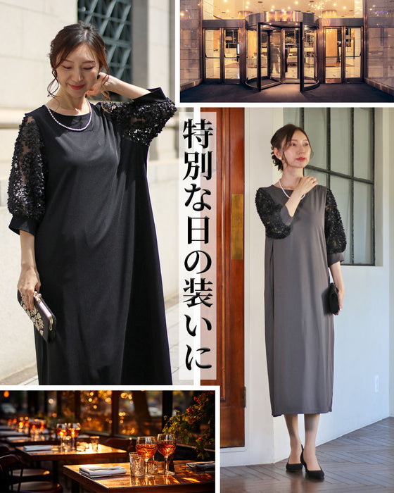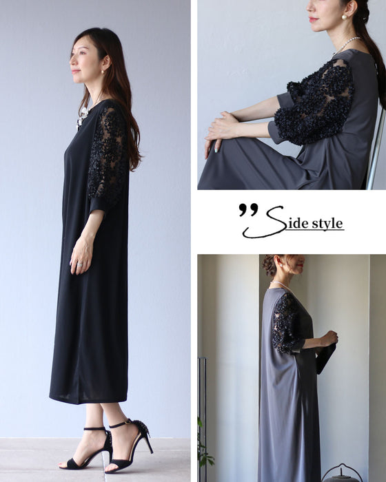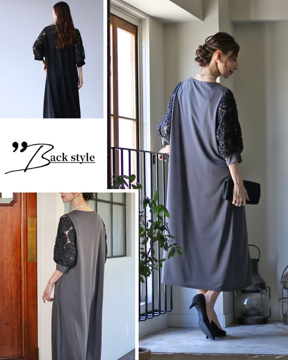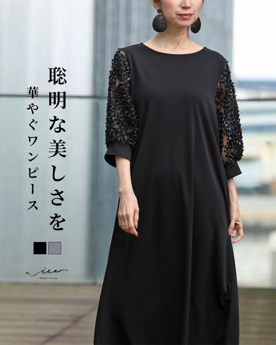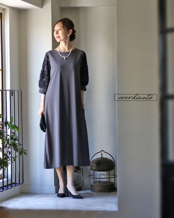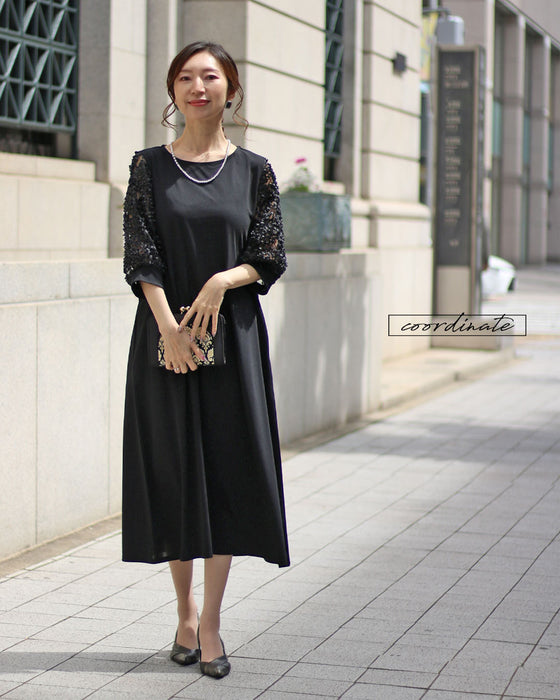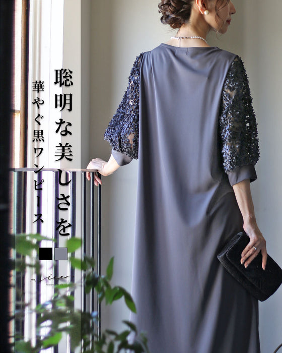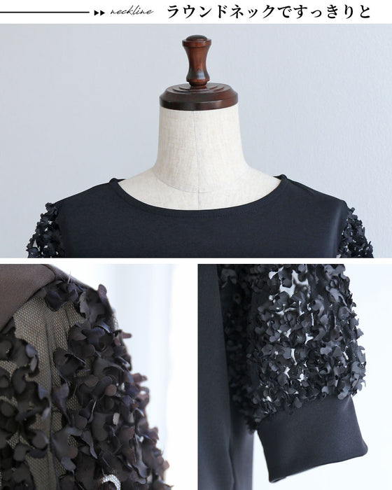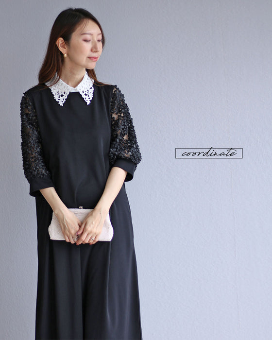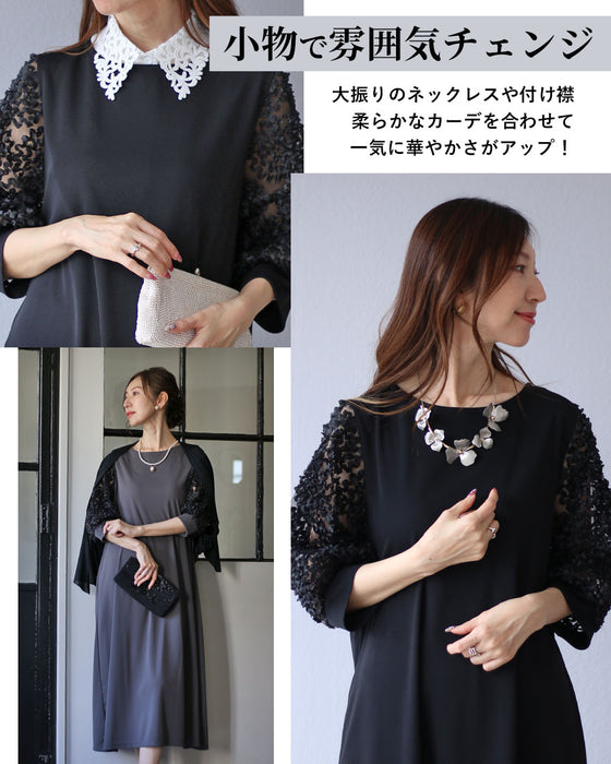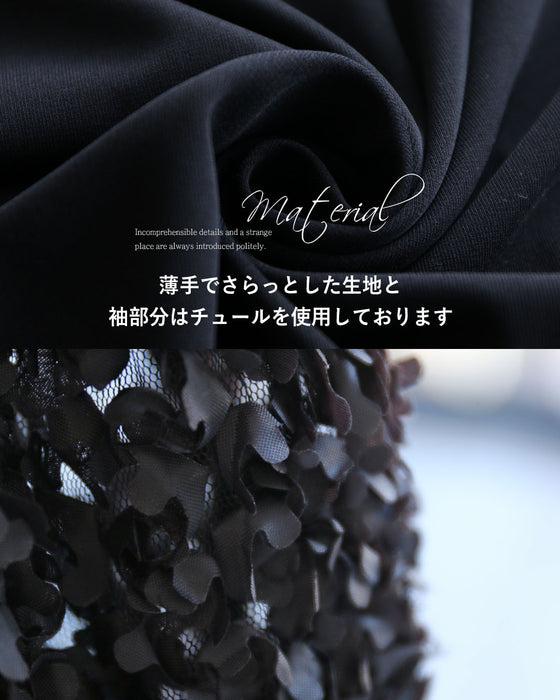 このワンピースは、特別な日にふさわしい装いに仕上げてくれます。 袖部分に施されたシアーな花モチーフが、可憐で立体感のあるアクセントを加え 着る人の美しさを引き立てます。