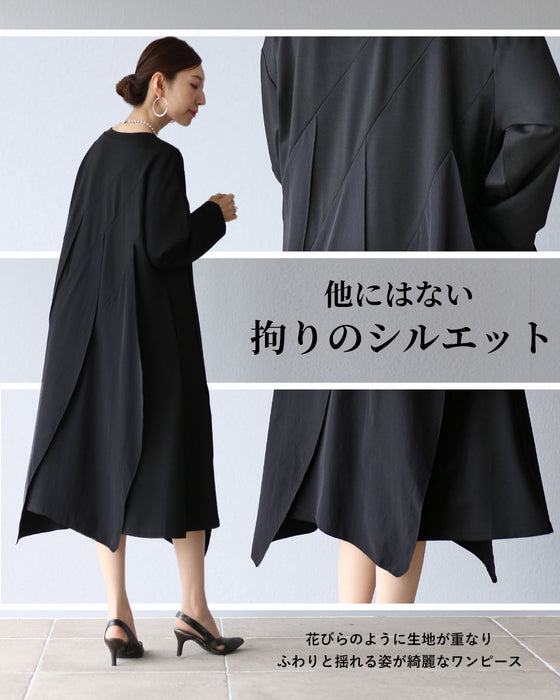 このワンピースは、ゆったりとしたシルエットで、体型カバーしながら美しく着こなせます。 着回しがしやすく、日常から特別な日まで幅広く活躍します。