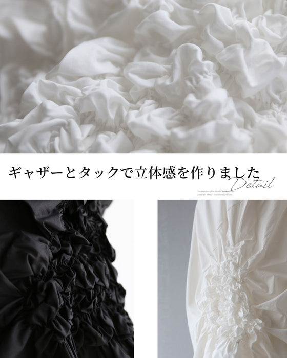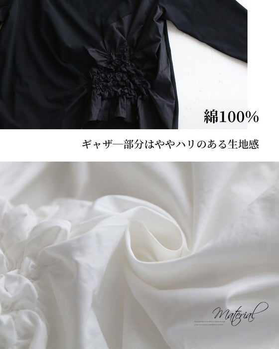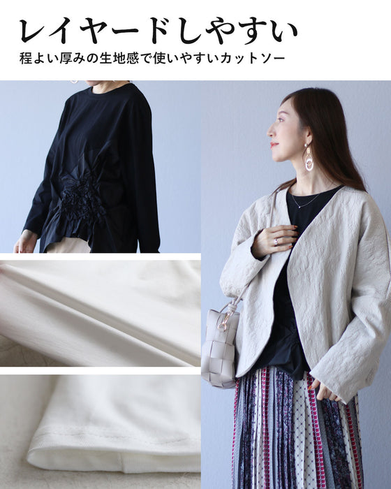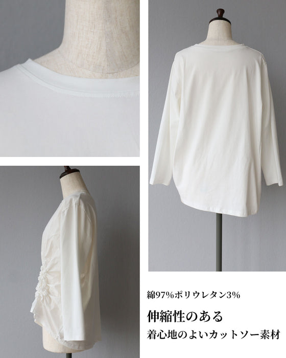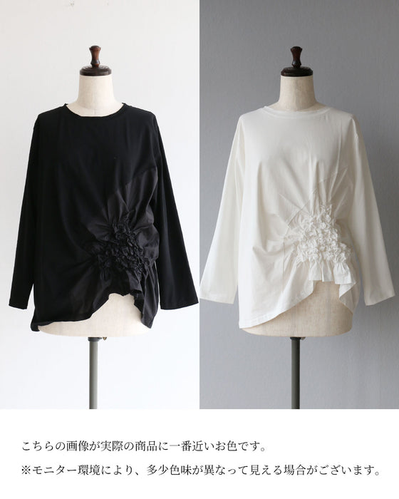 このカットソーは、立体的なギャザー花が特徴で、 シンプルながらもお洒落なデザインが魅力です。