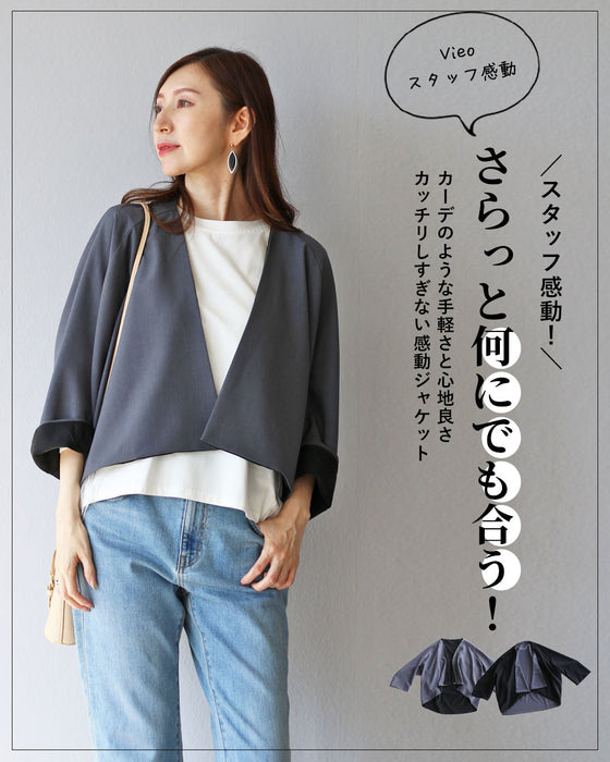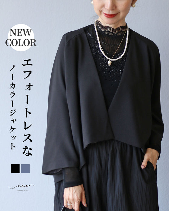 このノーカラージャケットは、カーディガンのような手軽さと心地良さを兼ね備え、 カッチリしすぎないエフォートレスなデザインが特徴です。