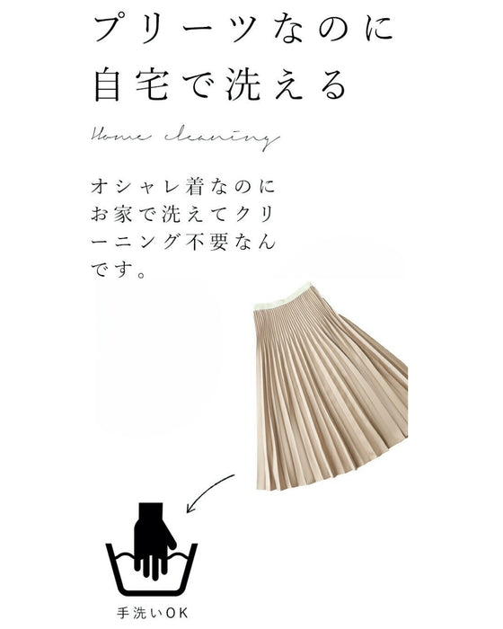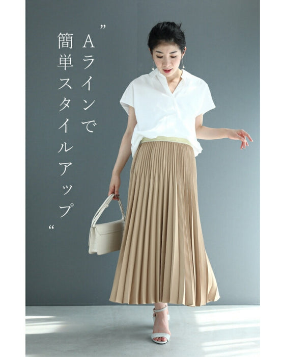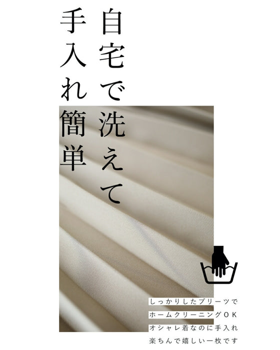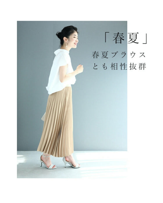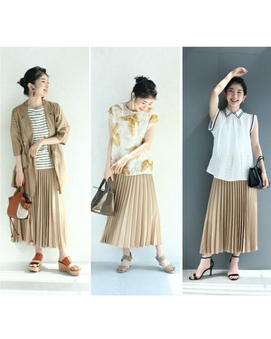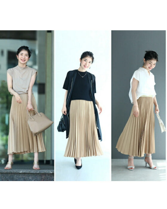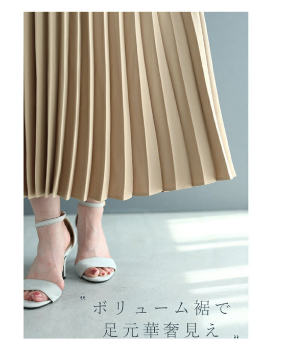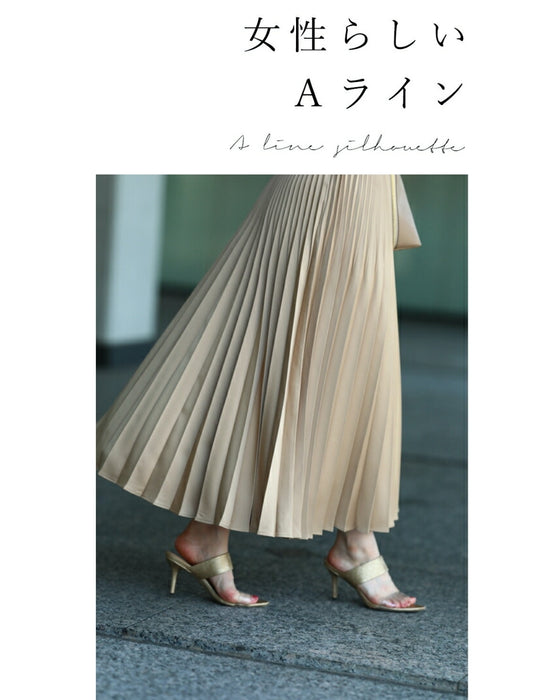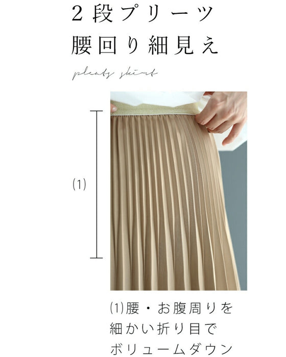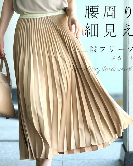 1段目の細かいプリーツは、腰・お腹周りを細かい折り目でボリュームダウン。2段目の大きいプリーツで裾に向かって広がるようボリュームアップ。女性らしいAラインシルエットがエレガントに。