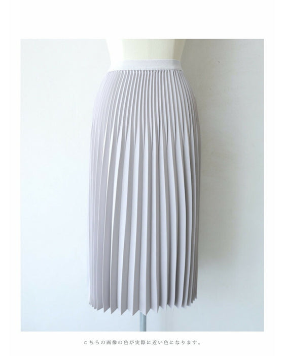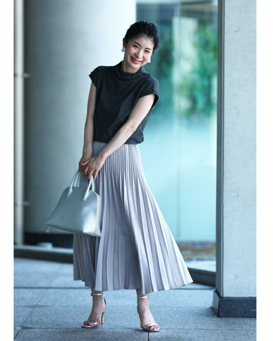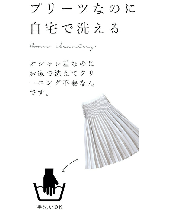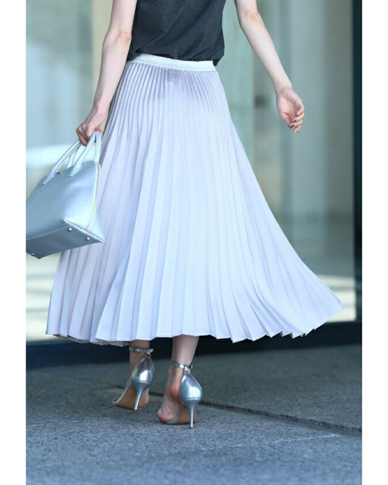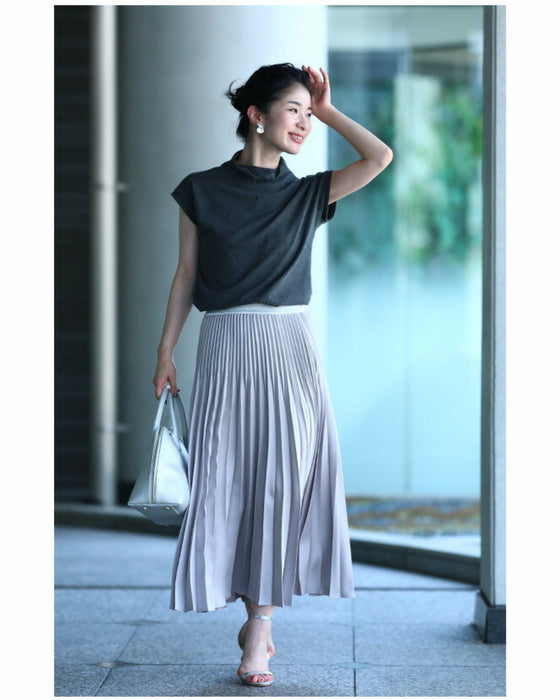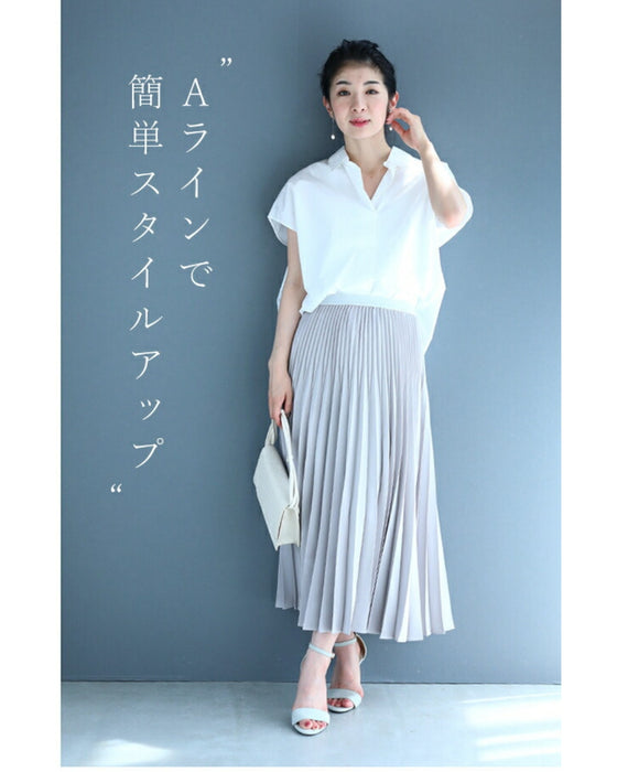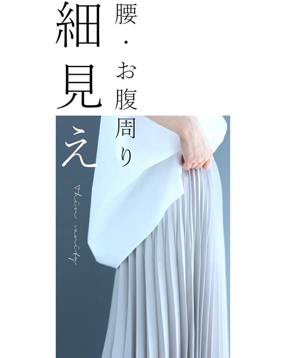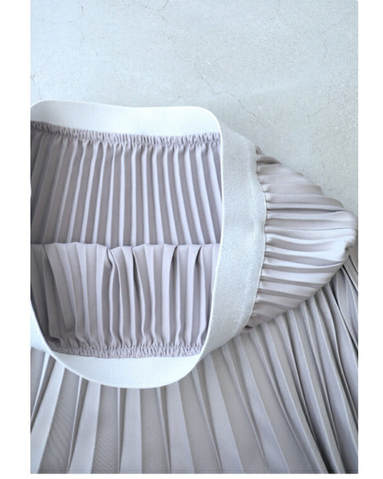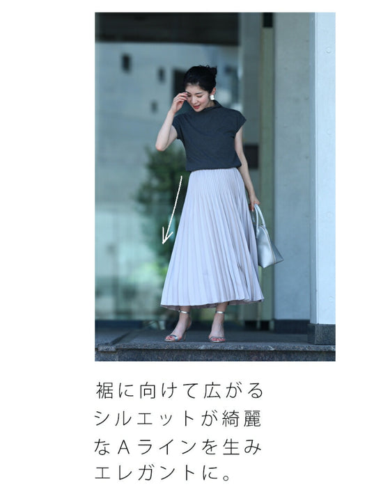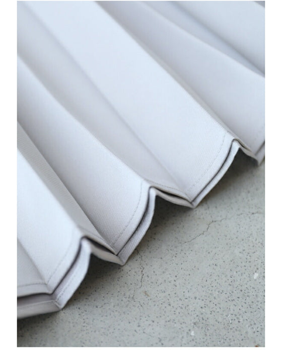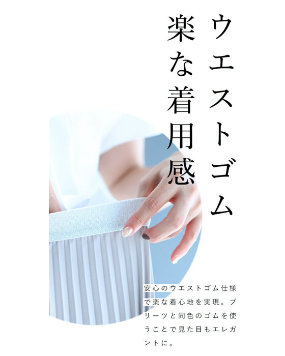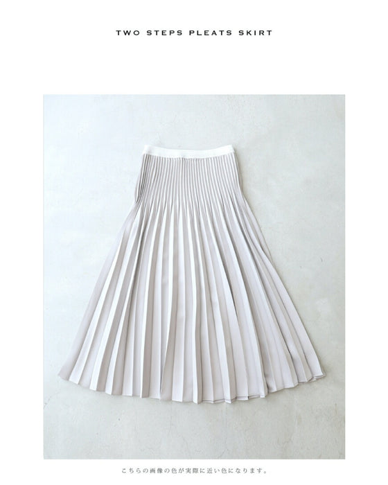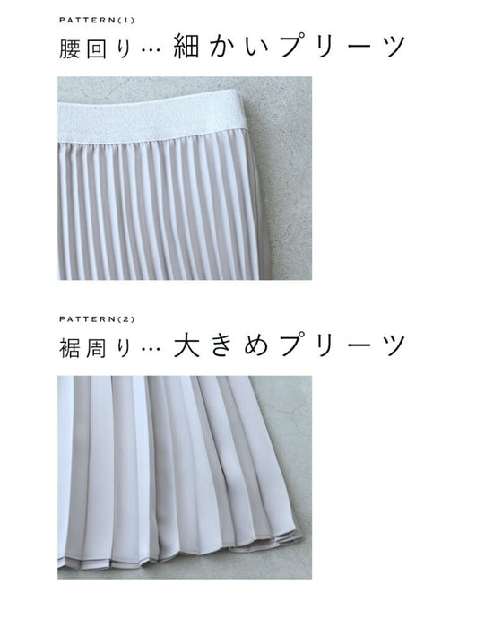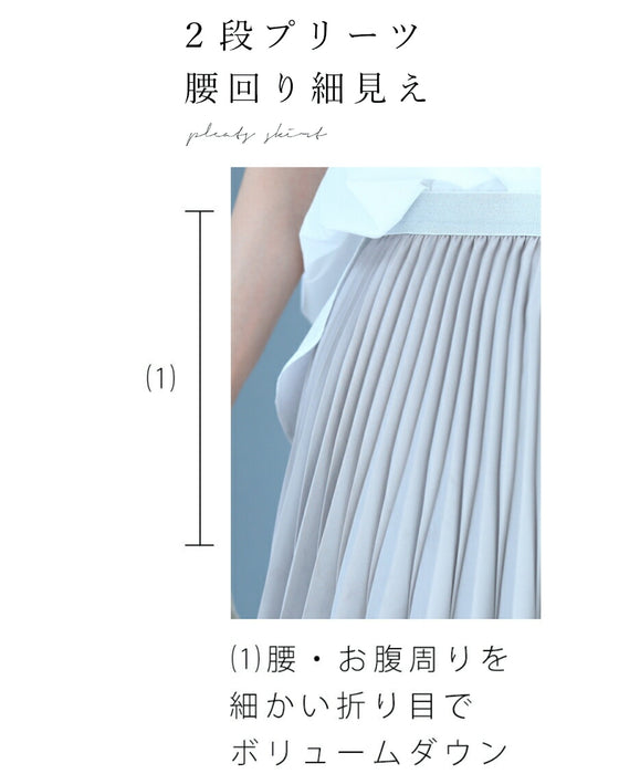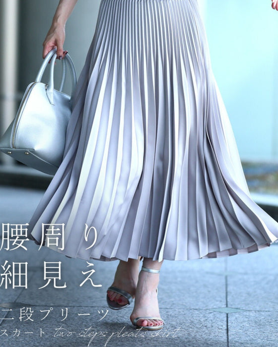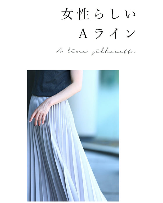 1段目の細かいプリーツは、腰・お腹周りを細かい折り目でボリュームダウン。2段目の大きいプリーツで裾に向かって広がるようボリュームアップ。女性らしいAラインシルエットがエレガントに。