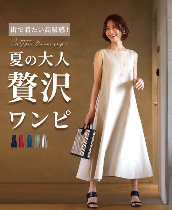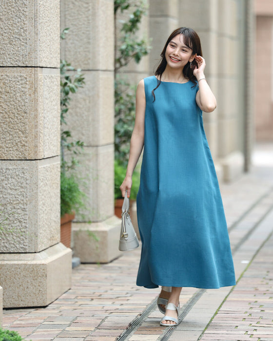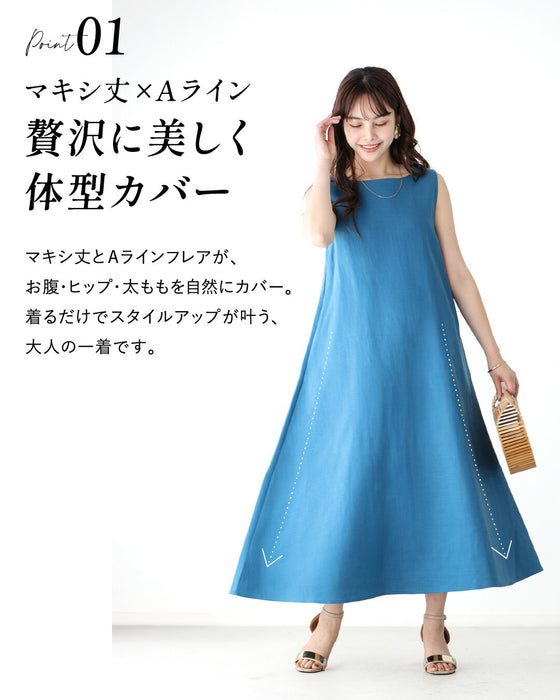 Linen one piece 01 マキシ丈で贅沢にフレアシルエット