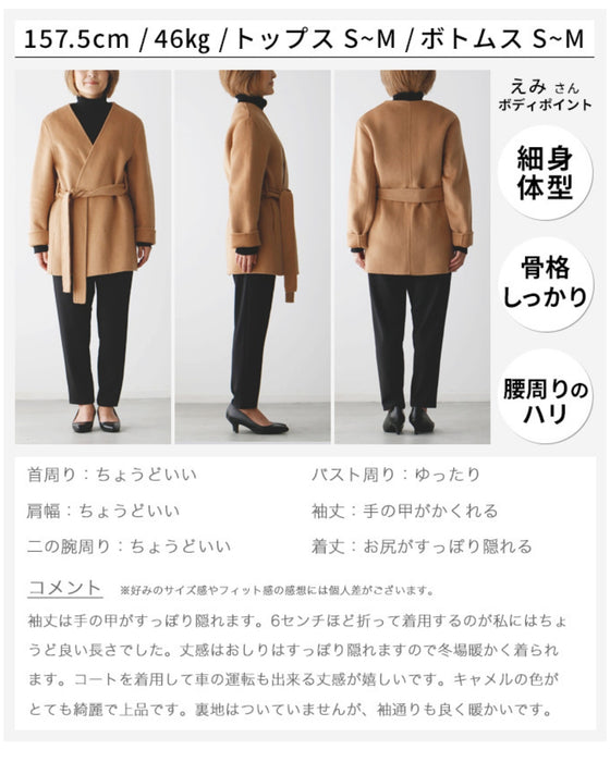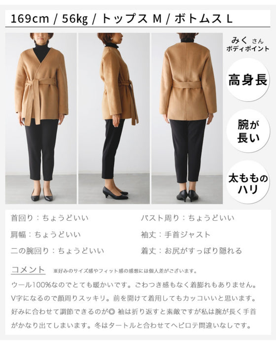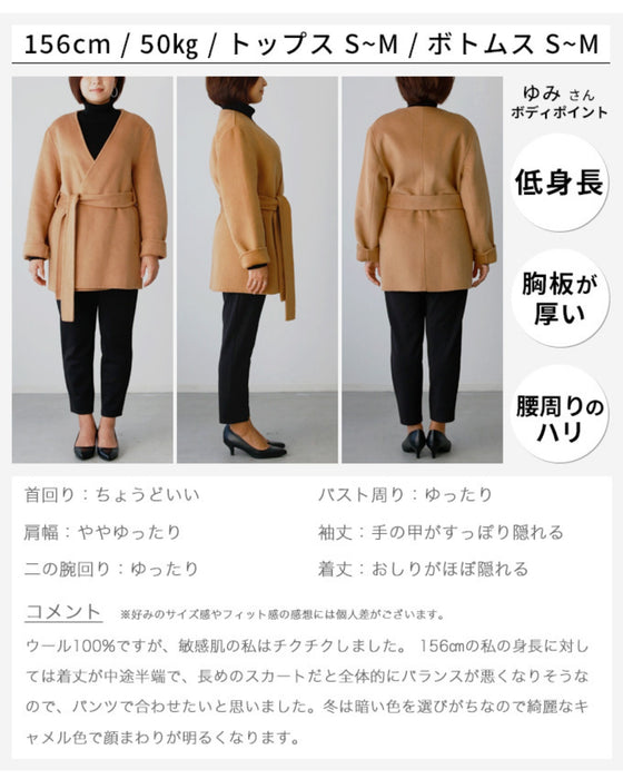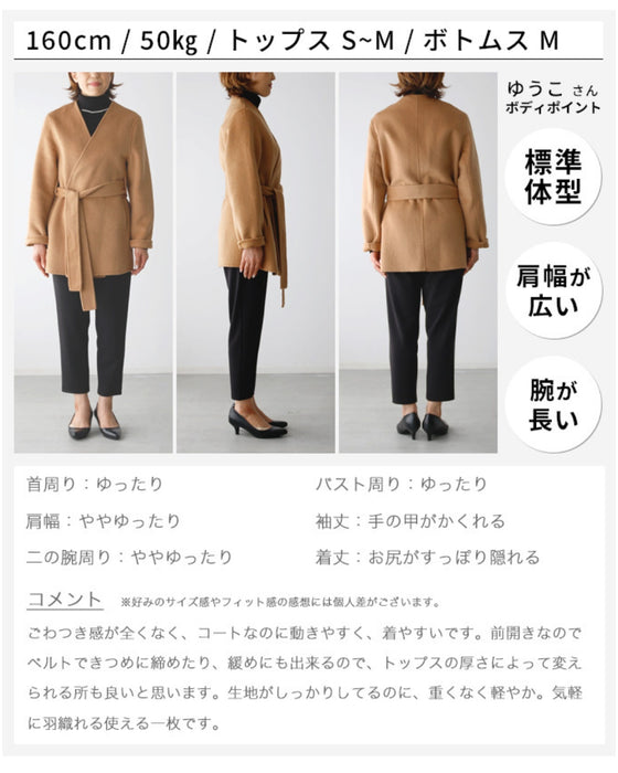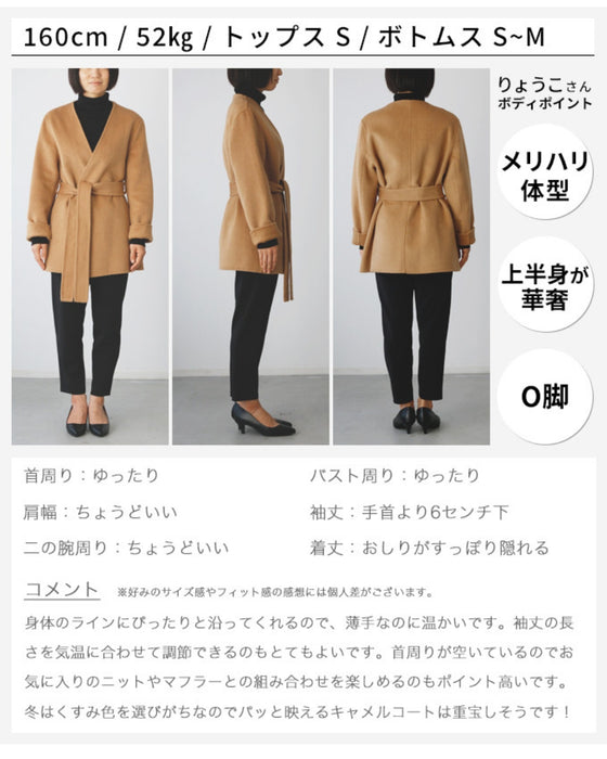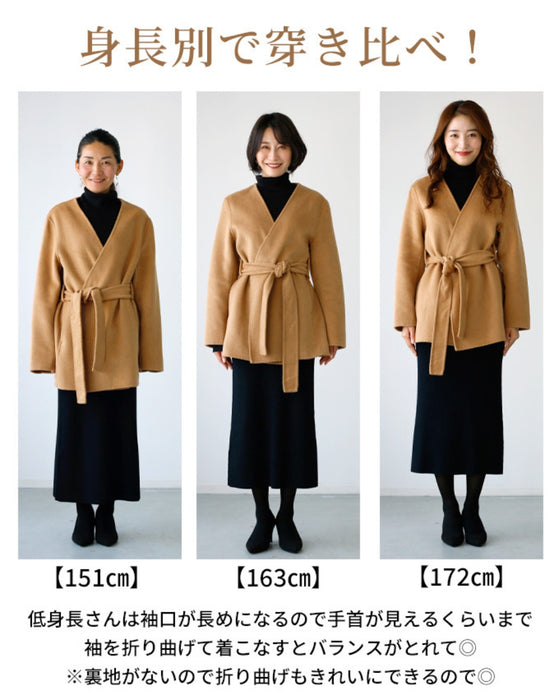 コート ショートコート フェルト ベルト ポケット ジャケット Vライン ノーカラー 無地 羽織 ボタンレス リッチ レディース フリーサイズ 毛 ウール混 Ehre style エーレスタイル 送料無料秋 冬