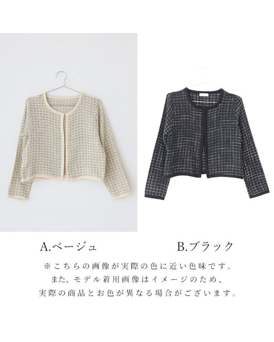 ジャケカーデ カーディガン パイピング ツイード 学校 仕事 行事 オケージョン ジャケット ベージュ ブラック きれいめ ノーカラー ショート丈 レディース フリーサイズ style スタイル 春 夏 秋 冬小柄さんもOK Ehrestyle