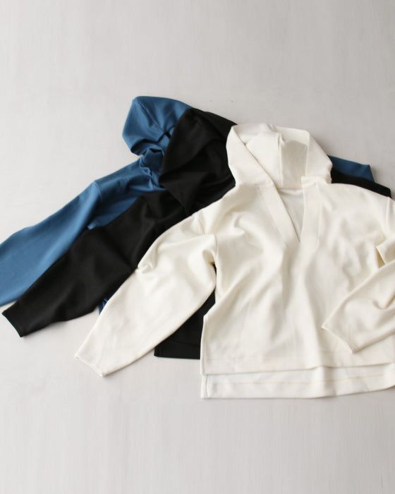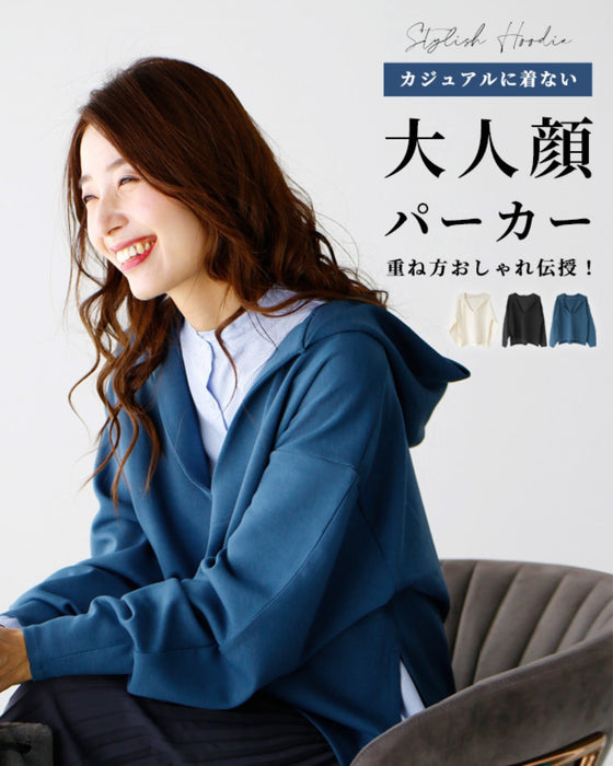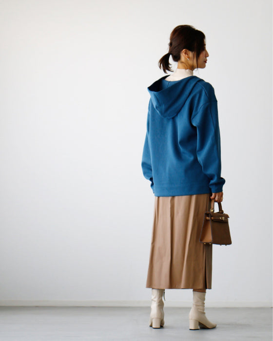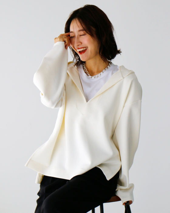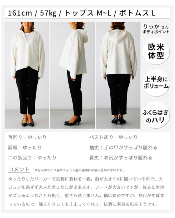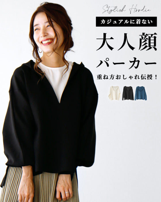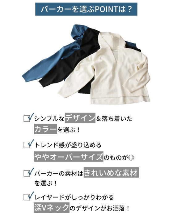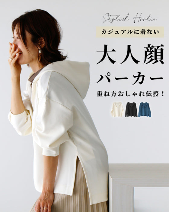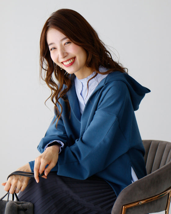 パーカー きれいめ フード レイヤード Vネック 長袖 小顔効果 ワイド ゆったり リラクシー サイドスリット ポンチ素材 ポンチ ノンストレス ストレッチ アイボリー ブラック ブルー 黒 Ehrestyle スタイル エーレスタイル フリーサイズ