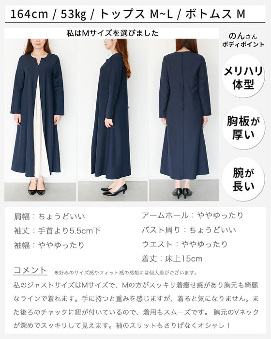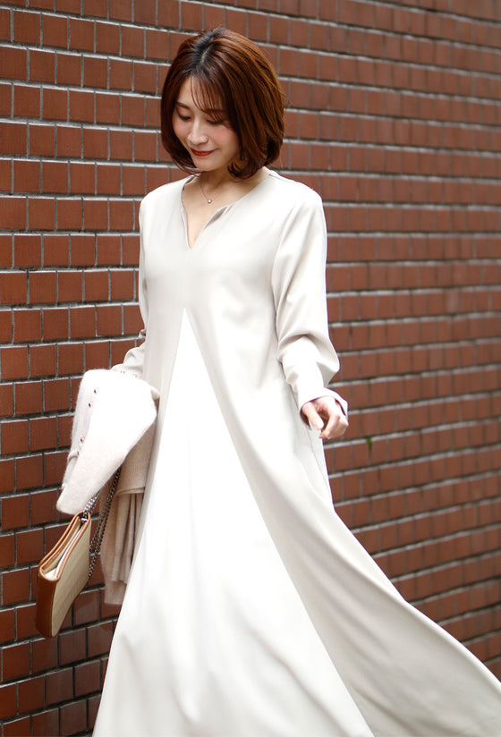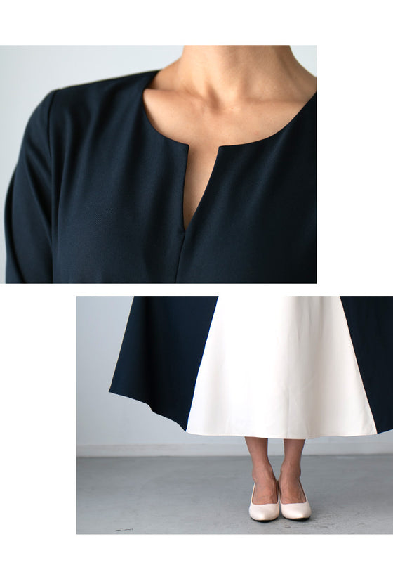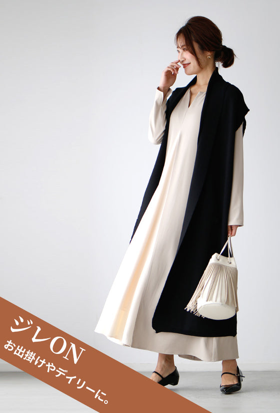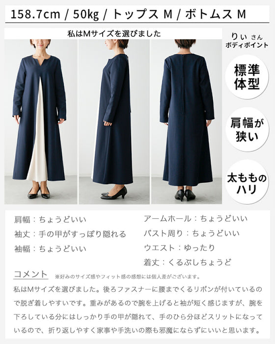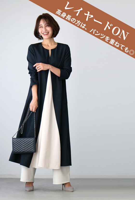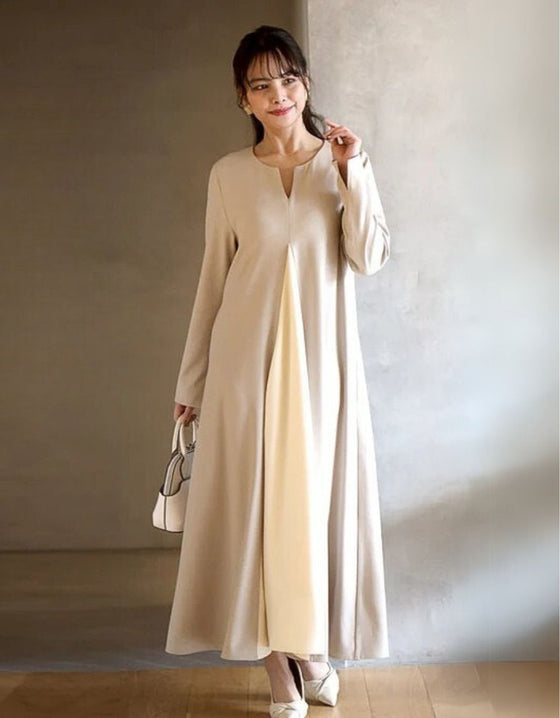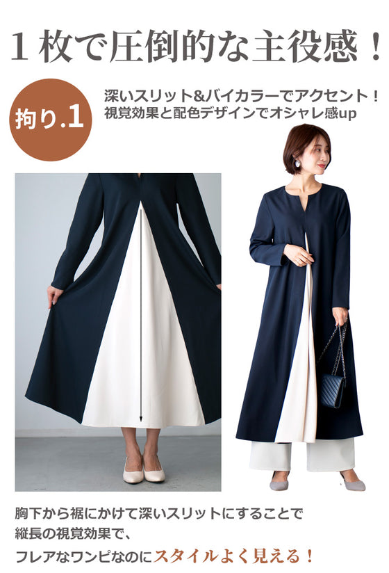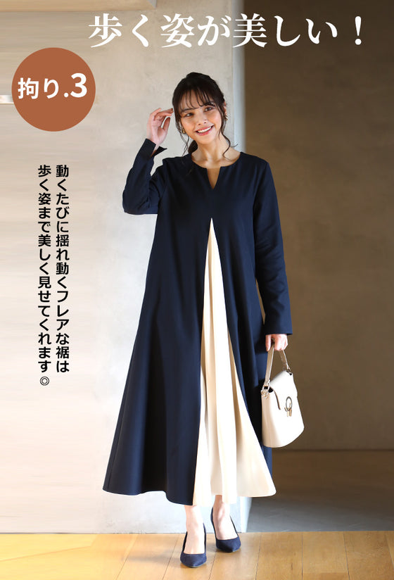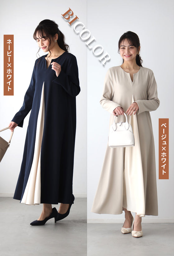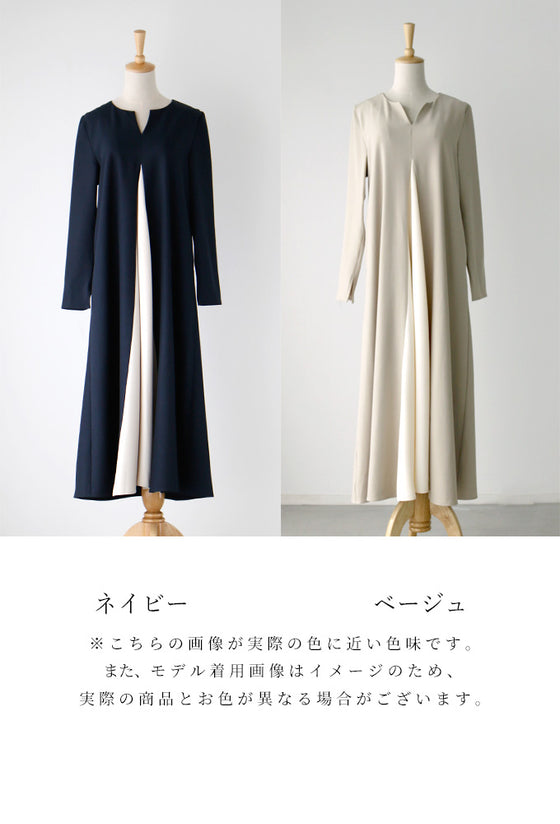 ワンピース ロングワンピース Aライン バイカラー 配色 スリット Vネック フレア レイヤード ジッパー ネイビー ベージュ Ehre style スタイル エーレスタイル フリーサイズ