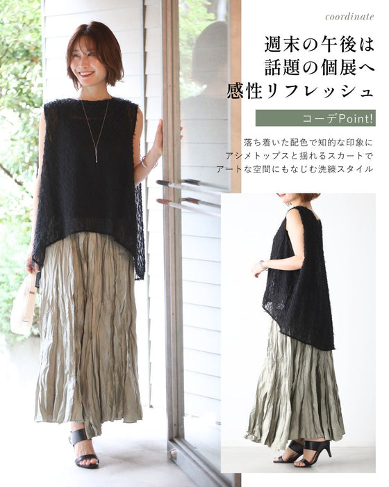 アシメトップスと揺れるスカートで、アートな空間にもなじむ洗練スタイル。