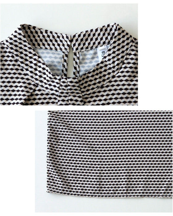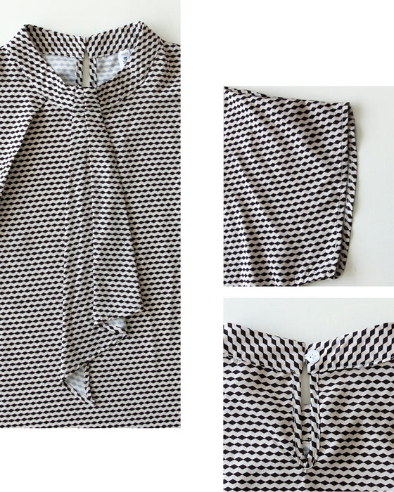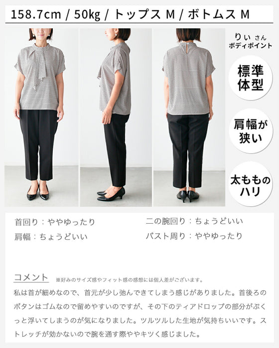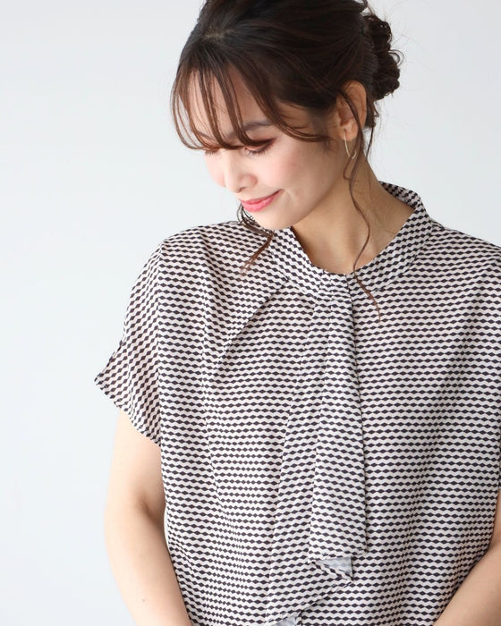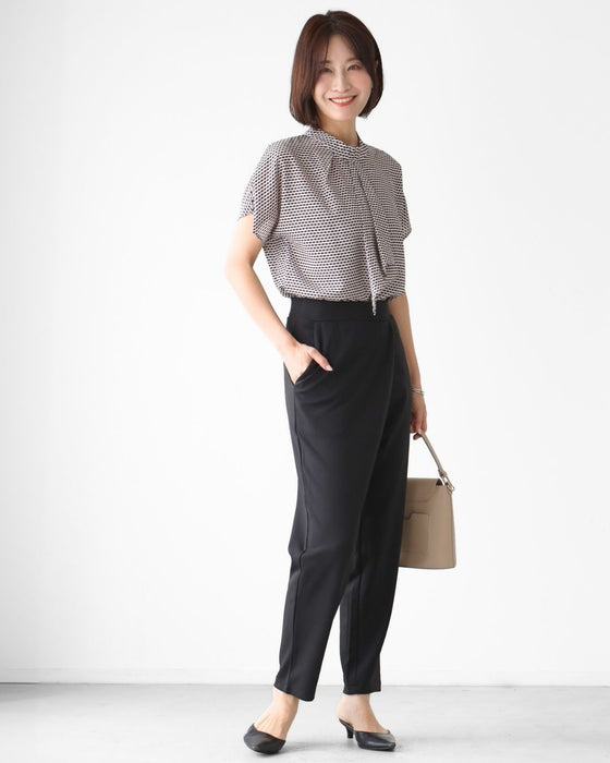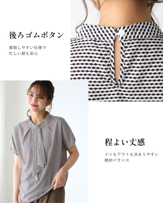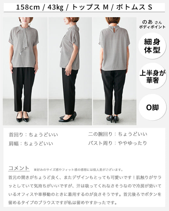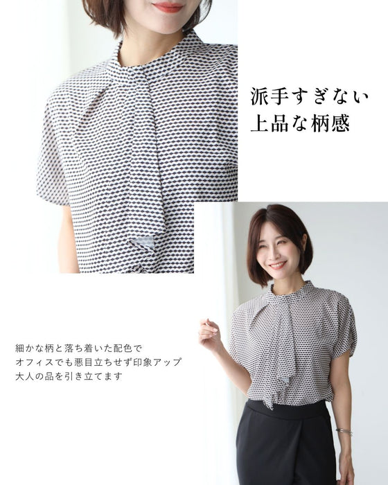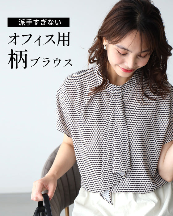ブラウス 柄ブラウス フォーマル 半袖 オフィス ボウタイ リボン 落ち着いた柄 シワにならない 襟後ろのボタン 黒 白 ブラック ホワイト ベージュ 春 夏 秋 フリーサイズ レディース ファッション Ehre style スタイル エーレスタイル