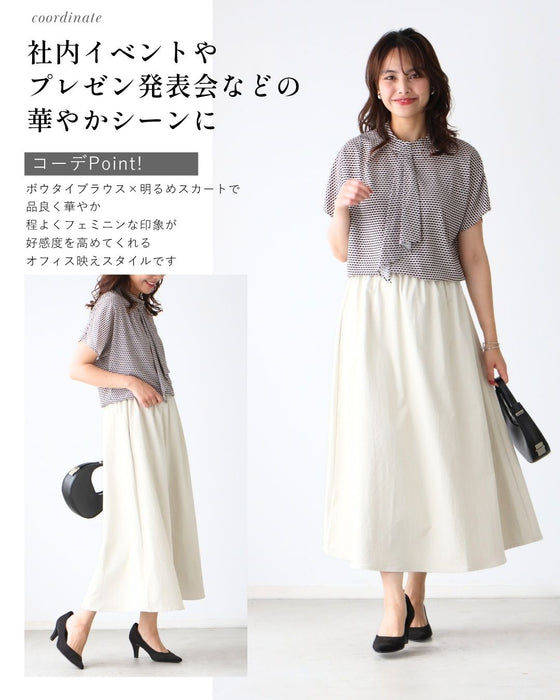 ボウタイブラウス×明るめスカートで品良く華やか。程よくフェミニンな印象が好感度を高めてくれるオフィス映えスタイルです。