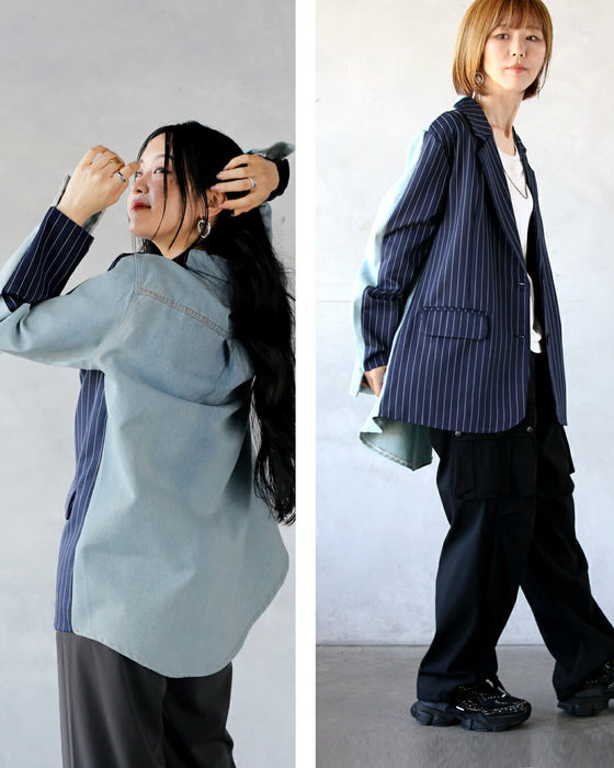 ■カジュアルもカッチリもOK!テーラードジャケットとデニムシャツをくっつけちゃった オシャレ過ぎる個性派ジャケット♪ 前はピンストライプでカチッとした印象。後ろはウォッシュ感あるデニム地でラフに。 プラスするだけで人と差が付くクールでカッコ良い大人女性にブラッシュアップ!