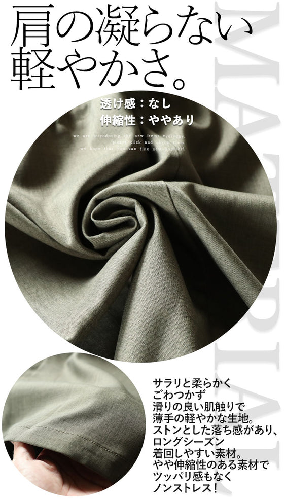 サラリと柔らかくごわつかず滑りの良い肌触りで薄手の軽やかな生地。ストンとした落ち感があり、ロングシーズン着回しやすい素材。やや伸縮性のある素材でツッパリ感もなくノンストレス!