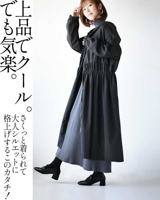 ■ゆったり楽で気負わないのに、ウエストのシャーリングですっきり細魅せ効果抜群! ロング丈で足元までカバーできるのにもっさりせず、小柄な方でもすっきり見せられます。 軽量のナイロン地だから、こんなにたっぷりの生地でも軽く楽な着心地です。