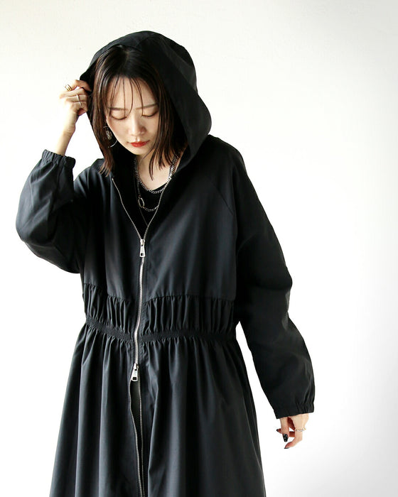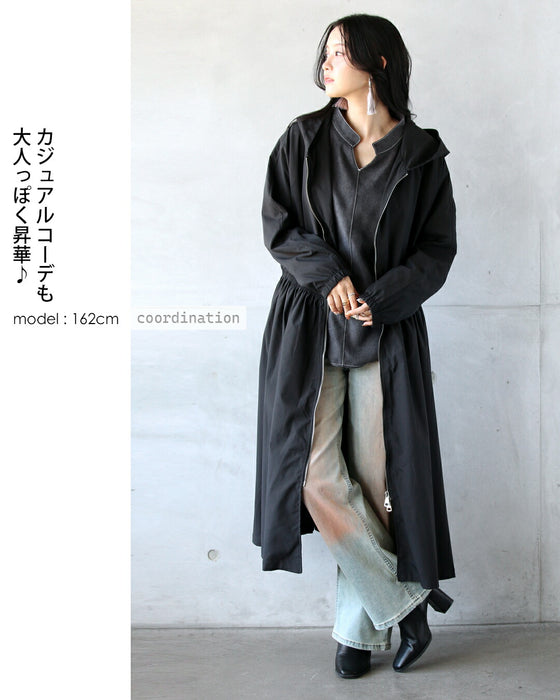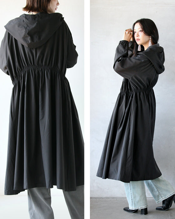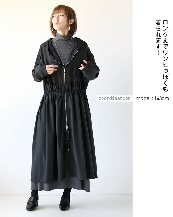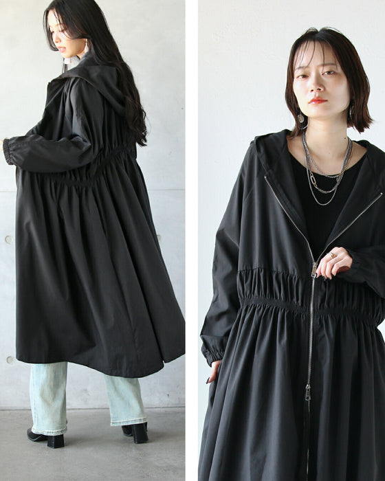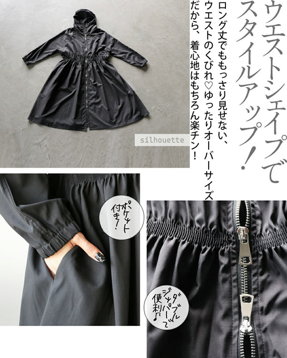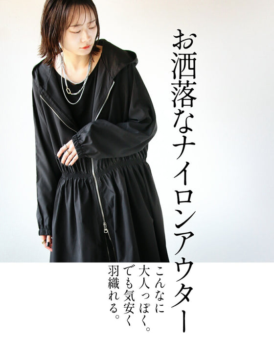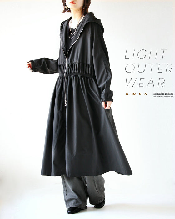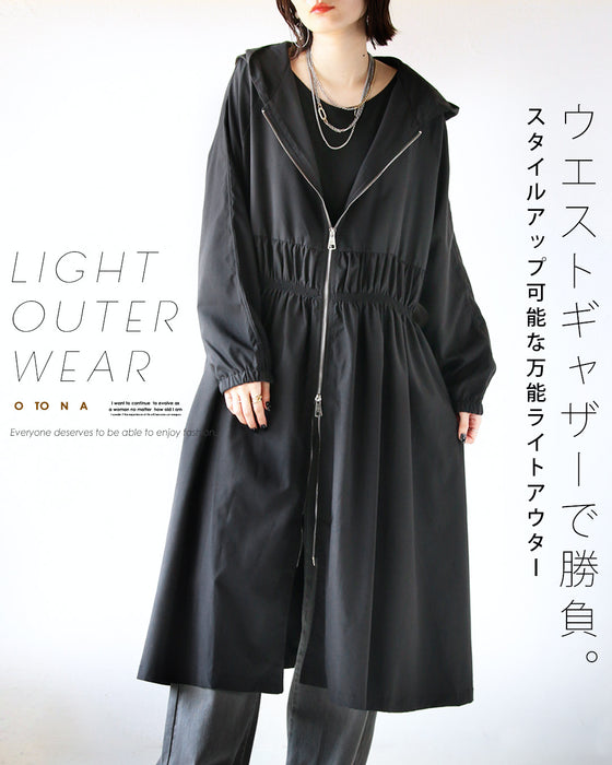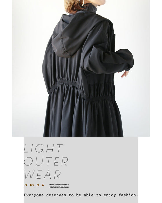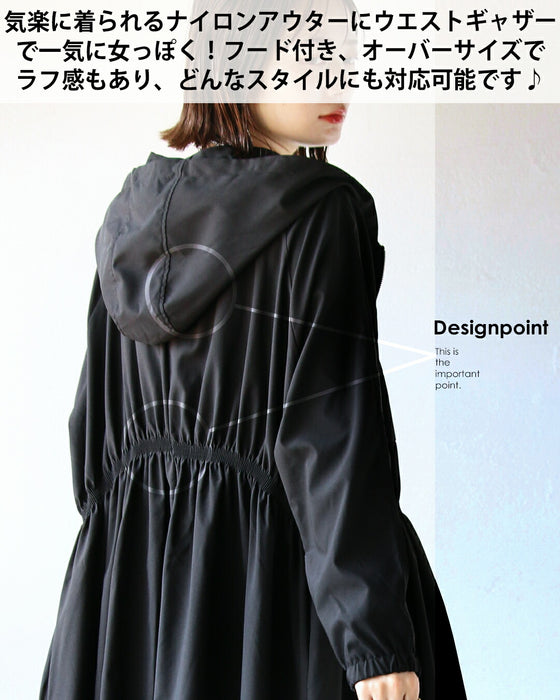 ■ウエストシェイプでスタイルアップ!ロング丈で上品に着こなせるライトアウターです。 気負わず長い季節着られる薄手のナイロンアウター。ウエストのギャザーで一気に女っぽく! フード付き、オーバーサイズでラフな雰囲気も内包し、どんなスタイリングにも対応可能です。