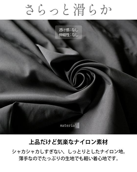 ■さらっと滑らかな、シャカシャカしずぎないしっとりとした上品なナイロン地。 薄手なのでたっぷりの生地でも軽い着心地です。