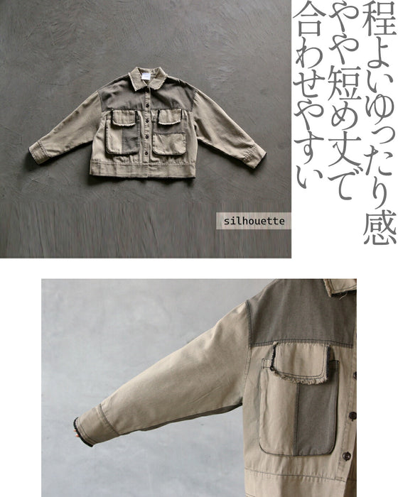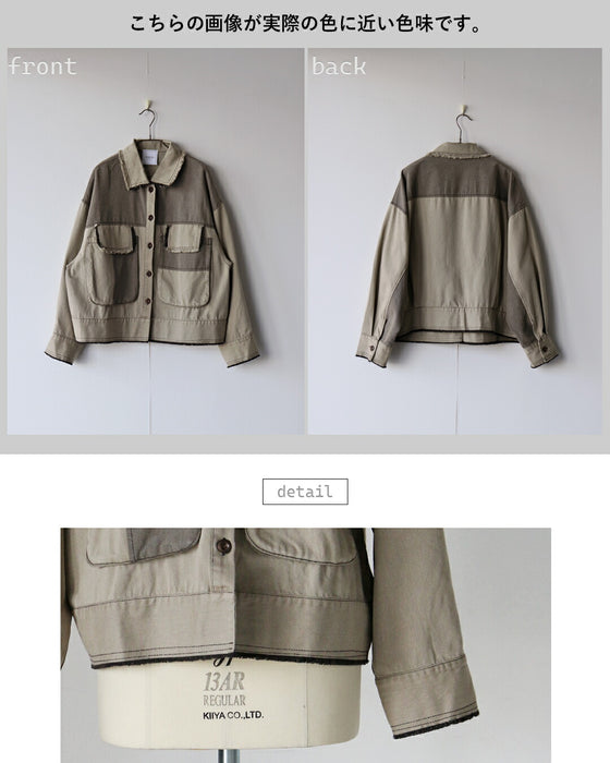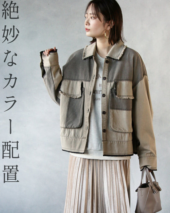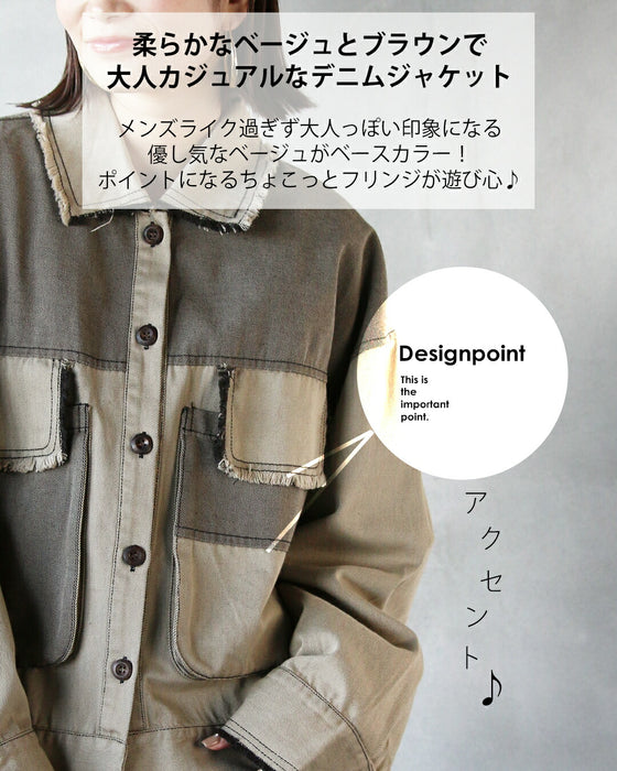 デニム生地とポイントになるちょこっとフリンジが、遊び心のあるメンズライクなデザイン。 優し気なベージュがベースカラーで、ワークな表情にも大人っぽさをプラス♪