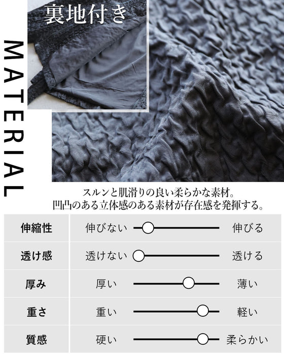 ■スルンと肌滑りの良い柔らかな素材。凹凸のある立体感のある素材が存在感を発揮する。