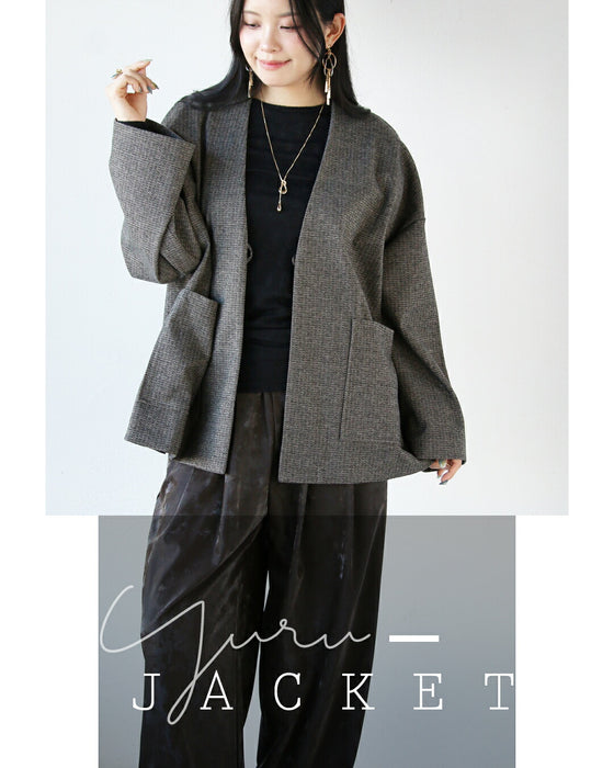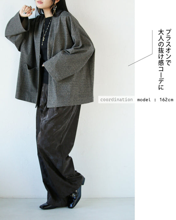 ツイード風の柄行でクラシカルに高見えしながら、軽やかに着られるノーカラーアウター。フロントはボタンがインナー仕様になっており、留めても開けてもフラットですっきり見えするのがポイント。大きめポケット付きで実用性もあり、ラフさときちんと感を両立した万能デザインです。