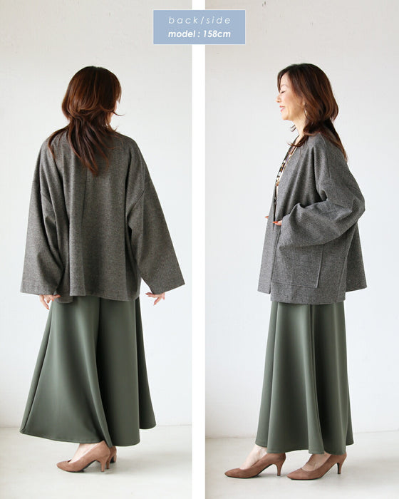 シンプルなニットやカットソーの上にさらっと羽織るだけで、大人の余裕を感じる抜け感コーデに。ワイドパンツやロングスカートと合わせればリラクシーに、ワンピースの上から羽織ればお出かけ仕様に。オンオフ問わず頼れる一枚です。