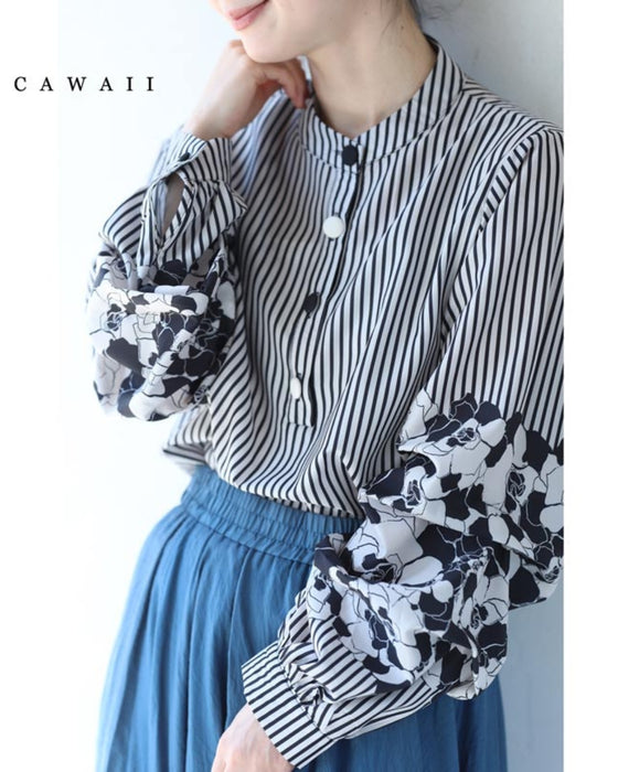 シンプルなボトムスによく映えます。カジュアルになるストライプ柄も花柄で可愛さと上品さががプラスされます。