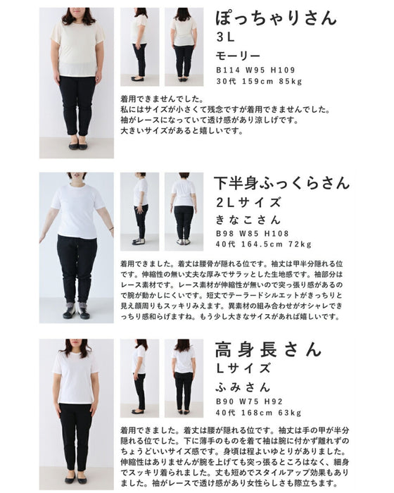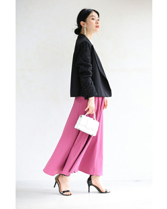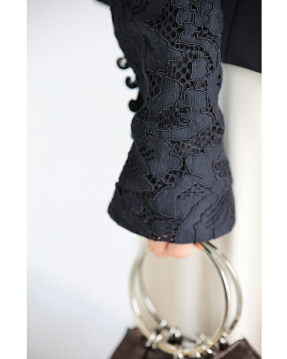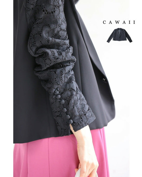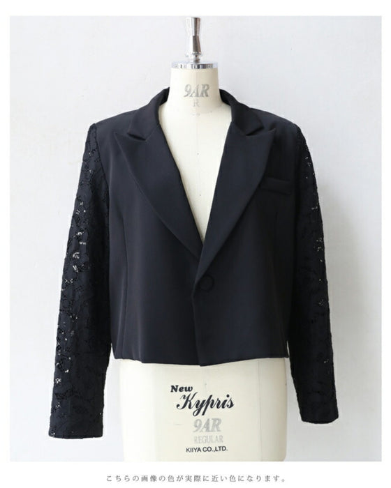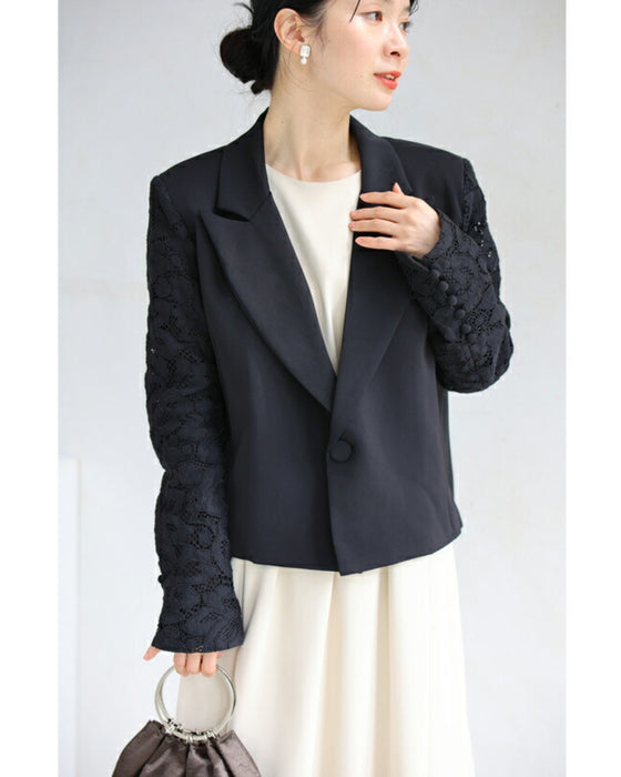 レース素材が袖部分に施されており、とてもエレガントな雰囲気を醸し出しています。袖のレースが華やかさを演出し女性らしい印象を与えてくれます。
