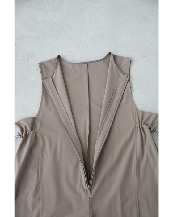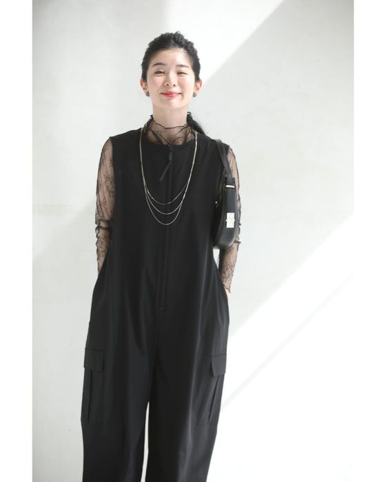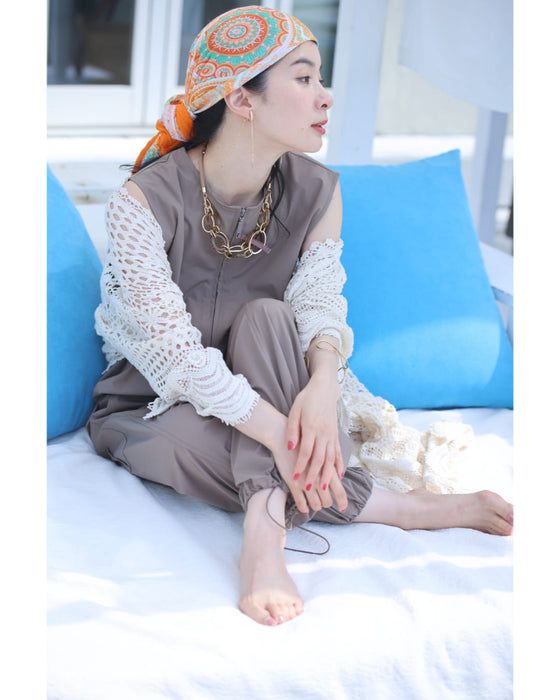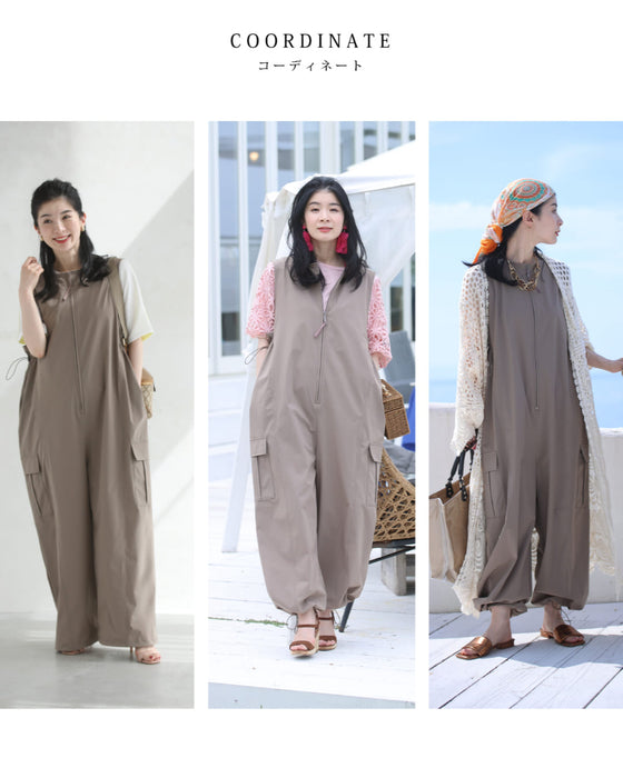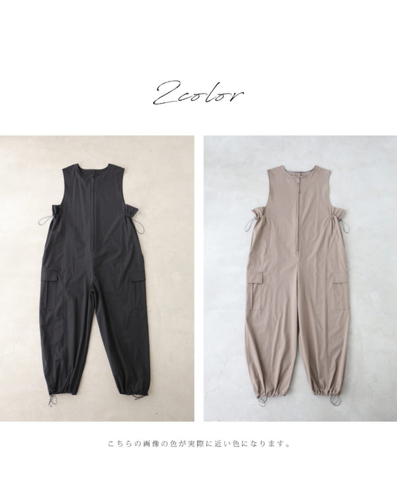 水着素材にも使われるラッシュガード生地で仕立てた、涼しくて軽やかなサロペット。日差しが強い日や、汗ばむ季節もさらっと快適。屋外レジャーや旅行にも頼れる一着です。