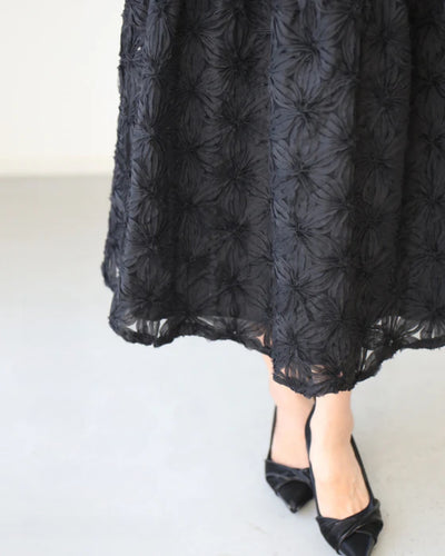 スカート 花柄 フラワー ボリューム ボトムス ミモレ丈 オーガンジー 総ゴム キレイめ お洒落 裏地付き 膝下 アイボリー ブラック Ivory black 白 黒 春 夏 秋 フリーサイズ レディース ファッション Ehre style エーレスタイル 小柄さんもOK Ehrestyle