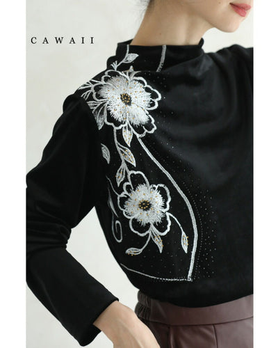 ビジューを纏う花刺繍のベロア調プルオーバートップス