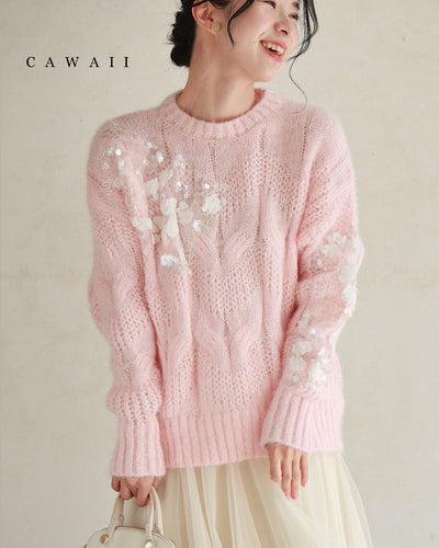 スパンコールが煌めくデコレーションチュールのニットプルオーバートップス