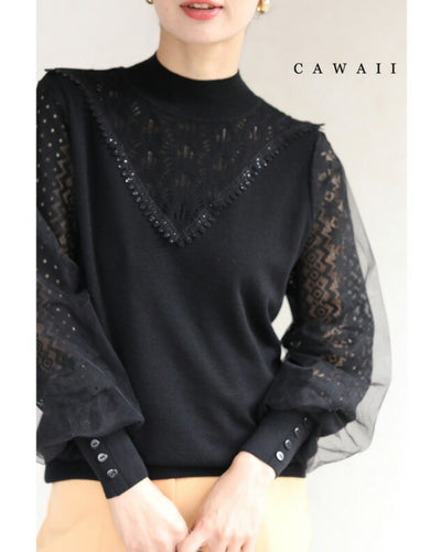 デコルテレースのベールポワン袖ニットプルオーバートップス