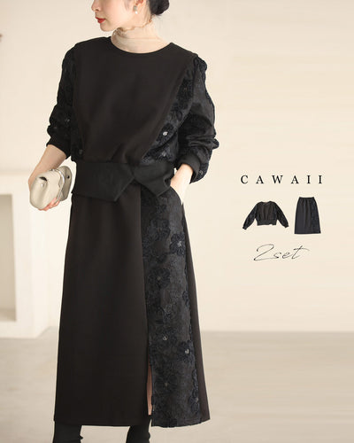 レースに浮かぶ黒花トップスとスリットスカート2点セット【set】