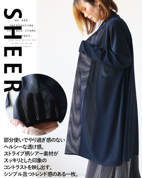 ■部分使いでやり過ぎ感のないヘルシーな透け感。ストライプ柄シアー素材がスッキリとした印象のコントラストを映し出す。シンプル且つトレンド感のある一枚。