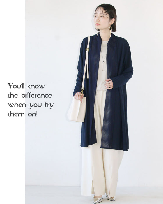 ■縦長効果のあるすっきりストンとした落ち感のあるシルエット。シンプルなカタチだから何枚あっても重宝するトッパーカーディガン。ロングな丈感で気になる部分もしっかりカバー&細魅せを叶えます。