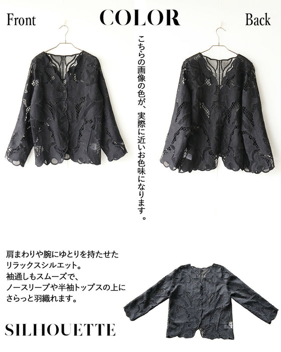 程よいハリ感と軽やかな透け感が魅力のカッティングレース素材。さらっとした肌触りで、春夏のライトアウターにぴったりです。