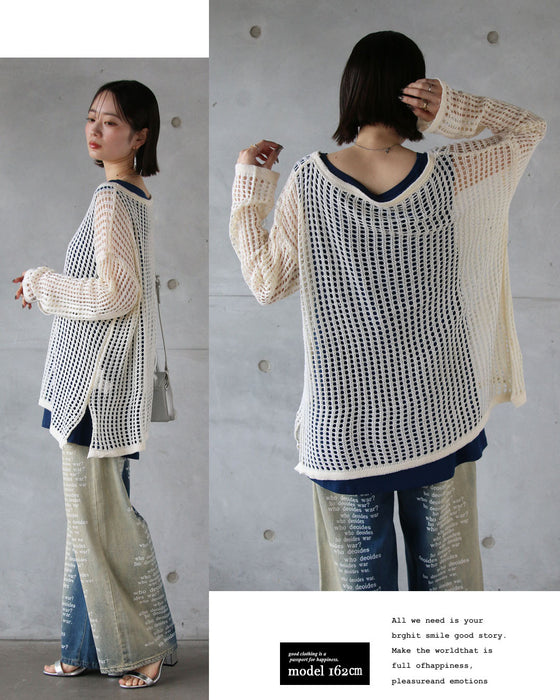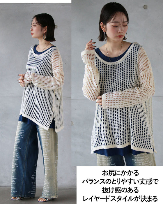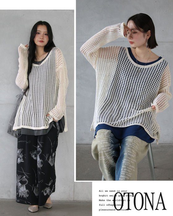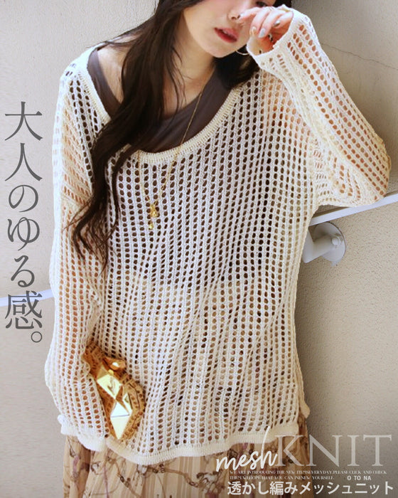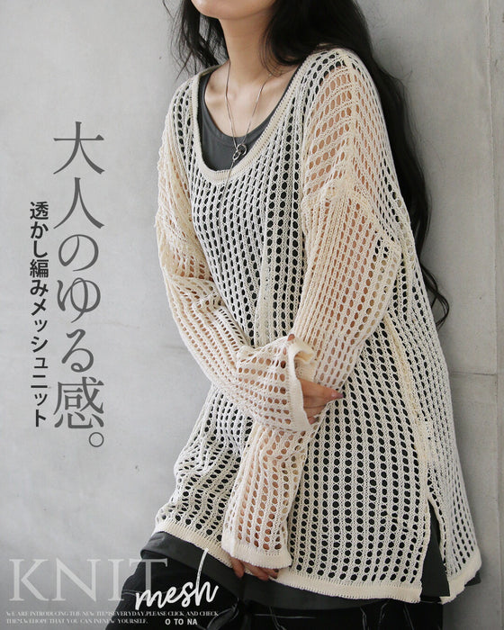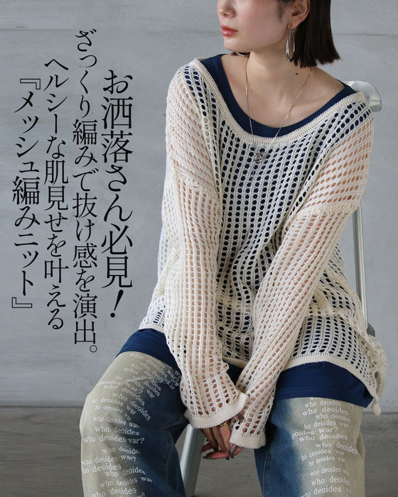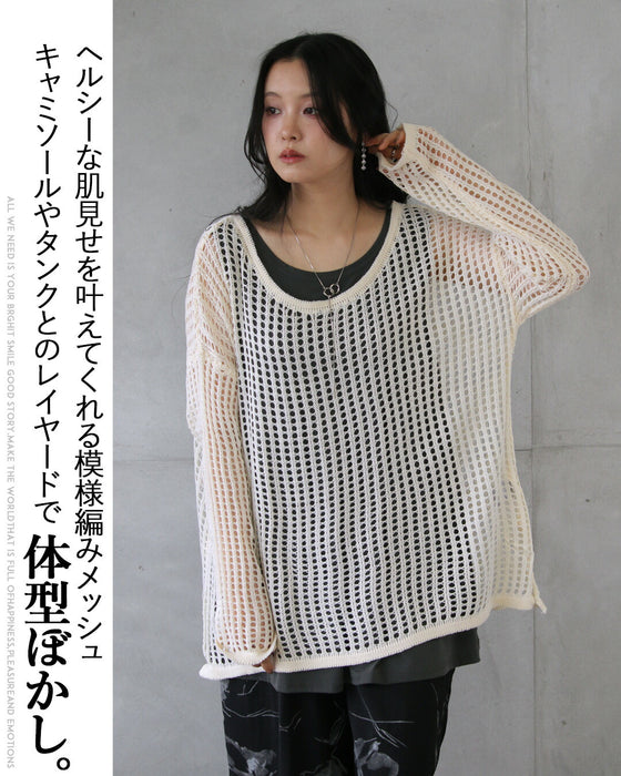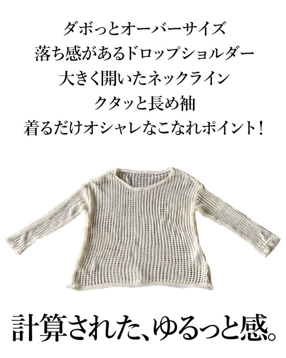 ■ざっくり編みで抜け感を演出。ヘルシーな肌見せを叶えるメッシュ編みニット。ダボっとオーバーサイズ、落ち感があるドロップショルダー、大きく開いたネックライン、クタッと長め袖 計算されたゆるっと感で着るだけオシャレがキマリます。