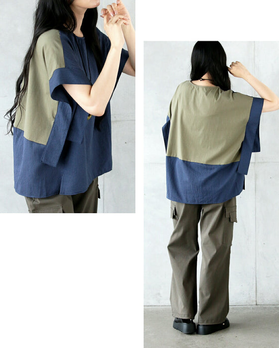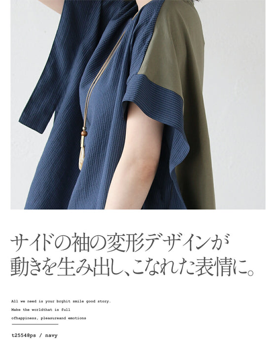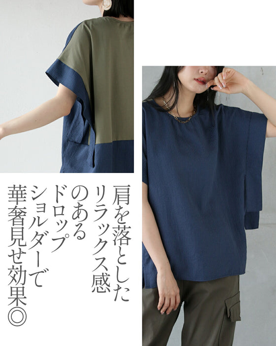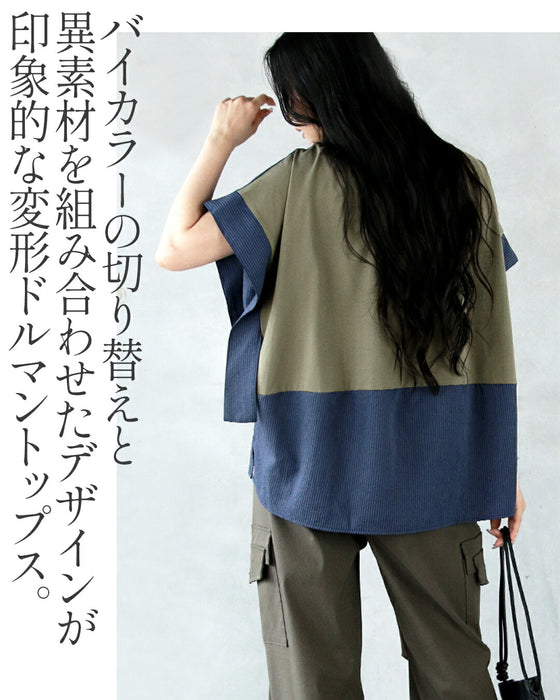 バイカラーの切り替えと異素材を組み合わせたデザインが印象的な変形ドルマントップス。