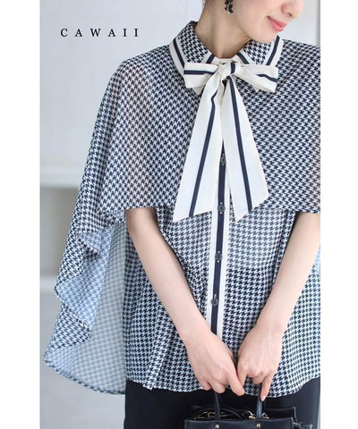 千鳥格子のふわり広がるマントデザインブラウストップス(リボン付き)