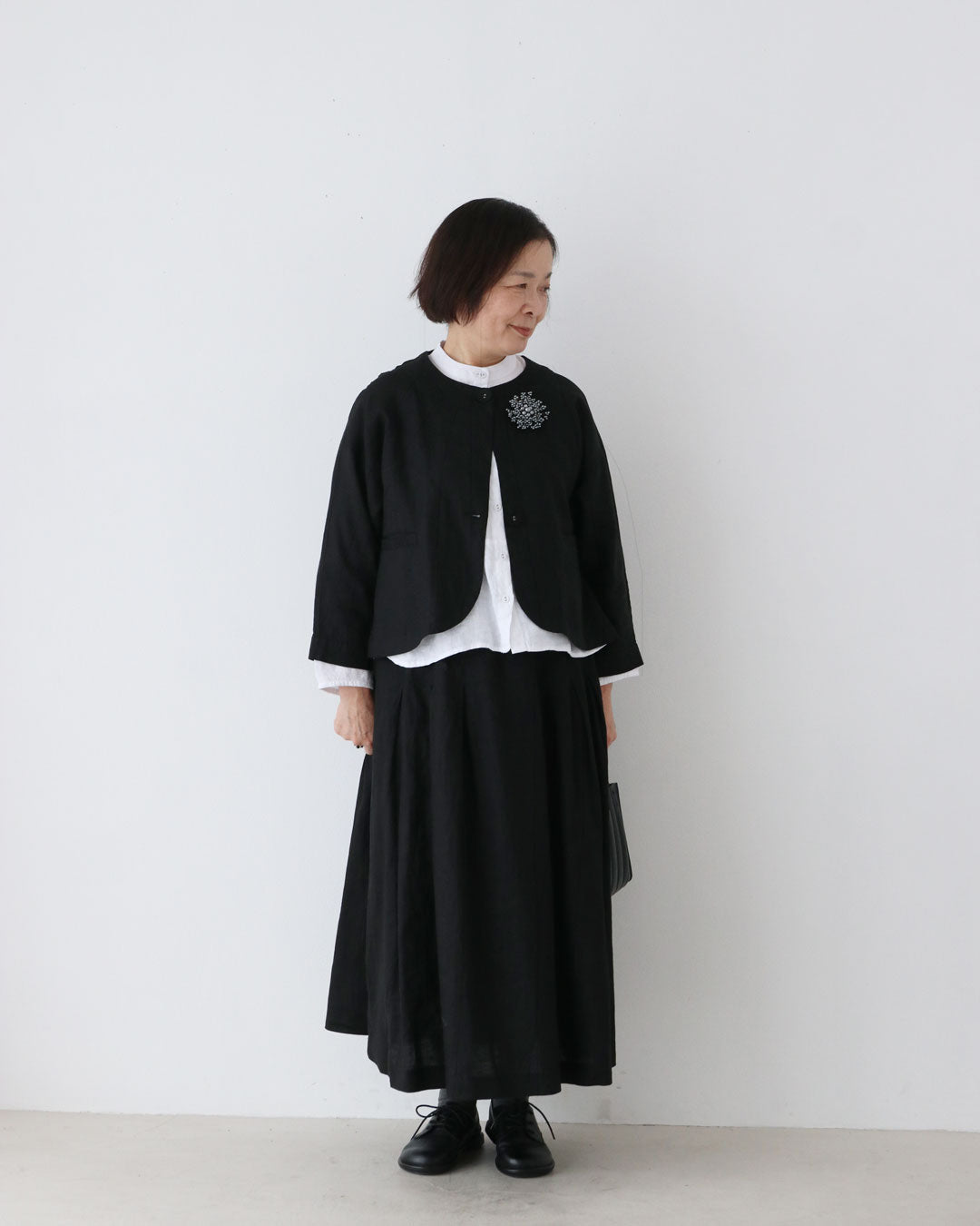 丸みのある裾のカットが女性らしいショートジャケットと、たっぷりとした落ち感が美しいロングスカートのセットアップ。