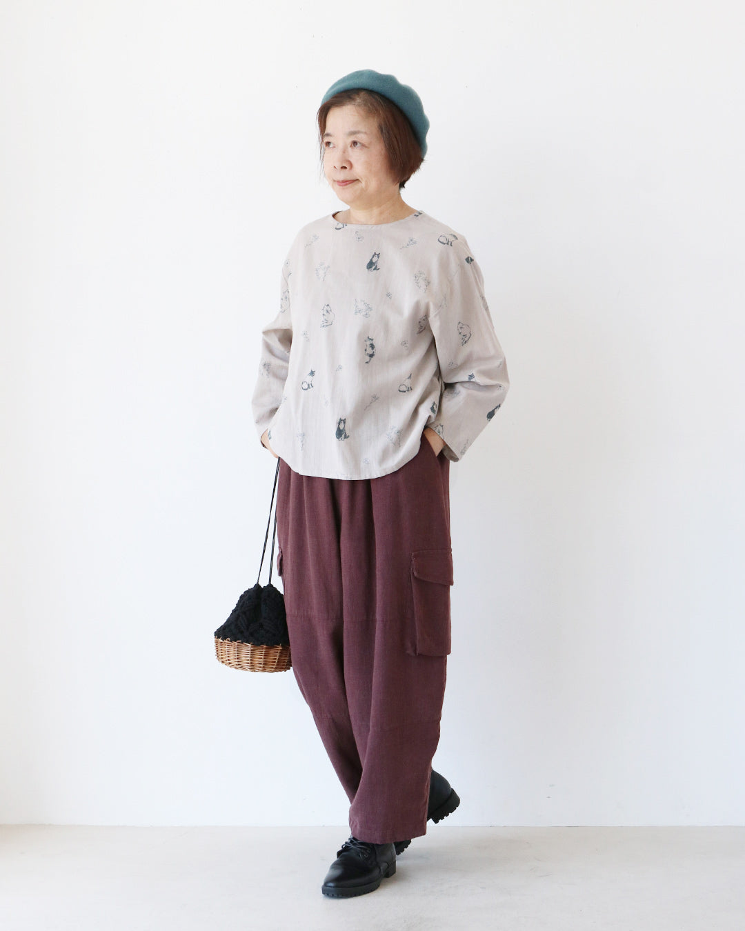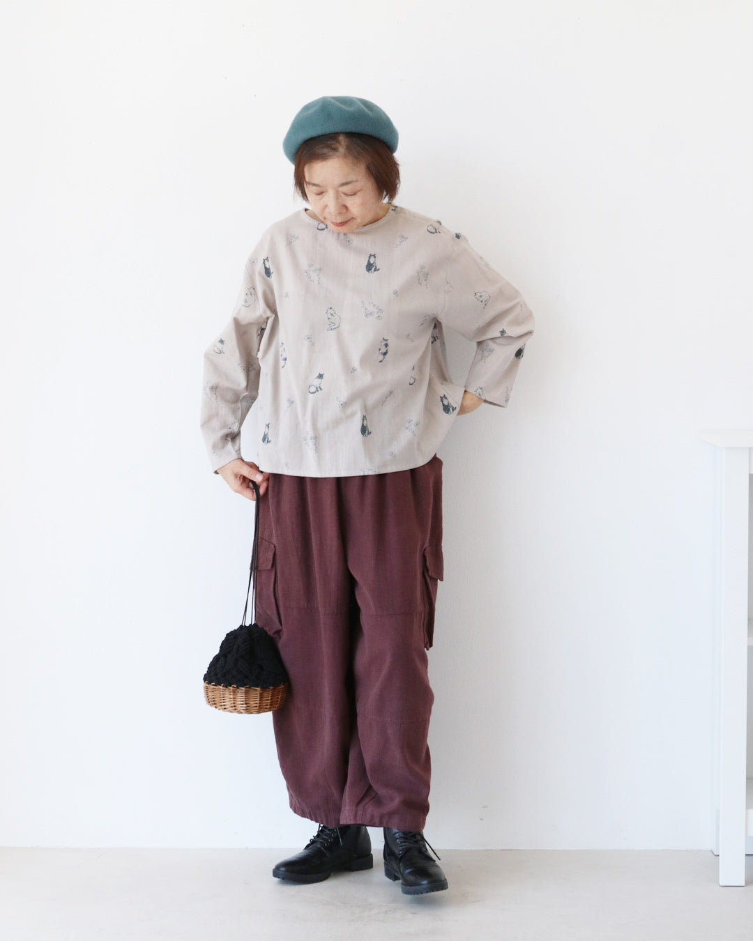 やさしいタッチのネコ柄ブラウスに、深みのあるボルドーカラーのパンツを合わせた秋のほっこりコーデ。