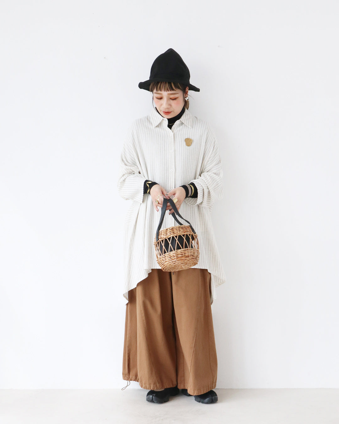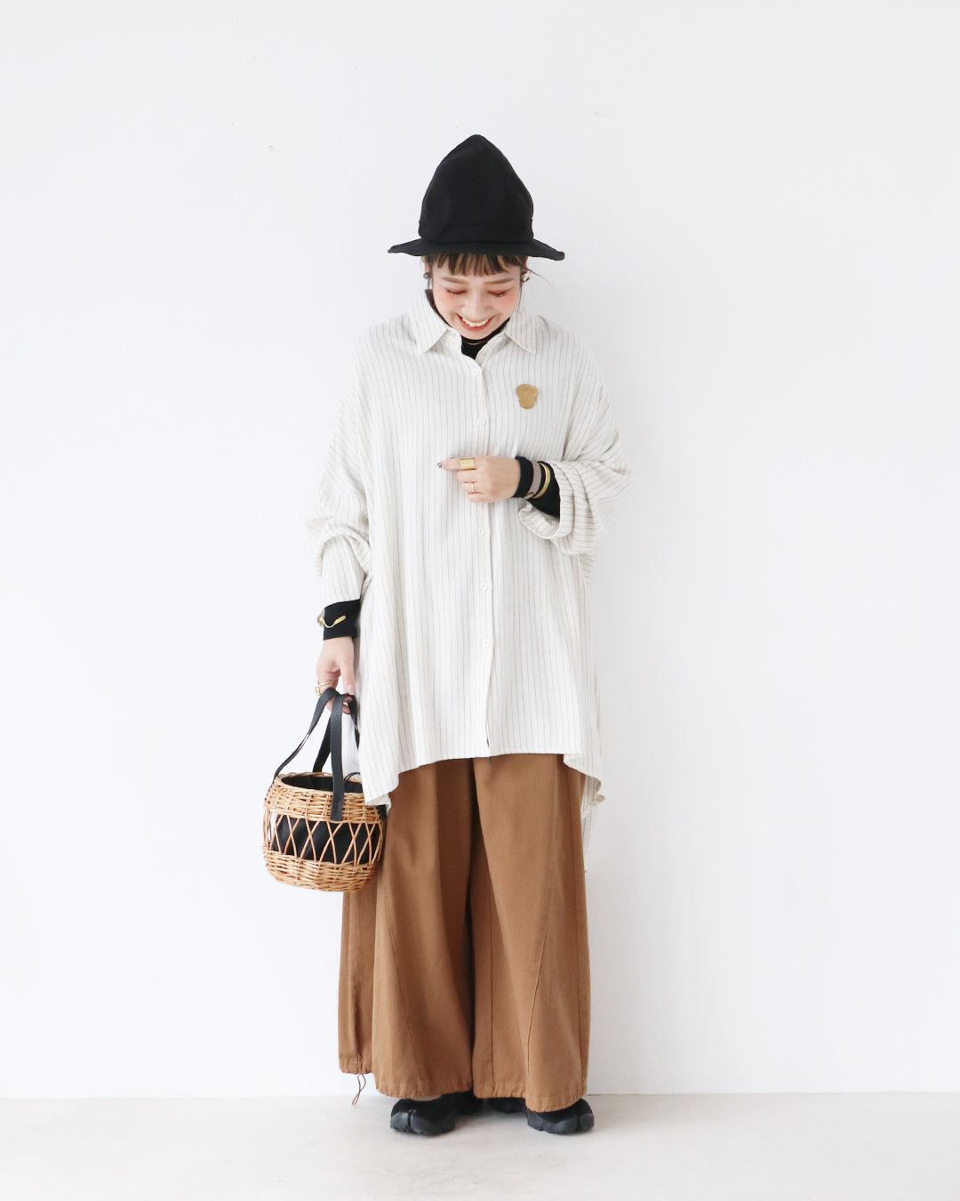ブラックのインナーとハットで全体を引き締めつつ、