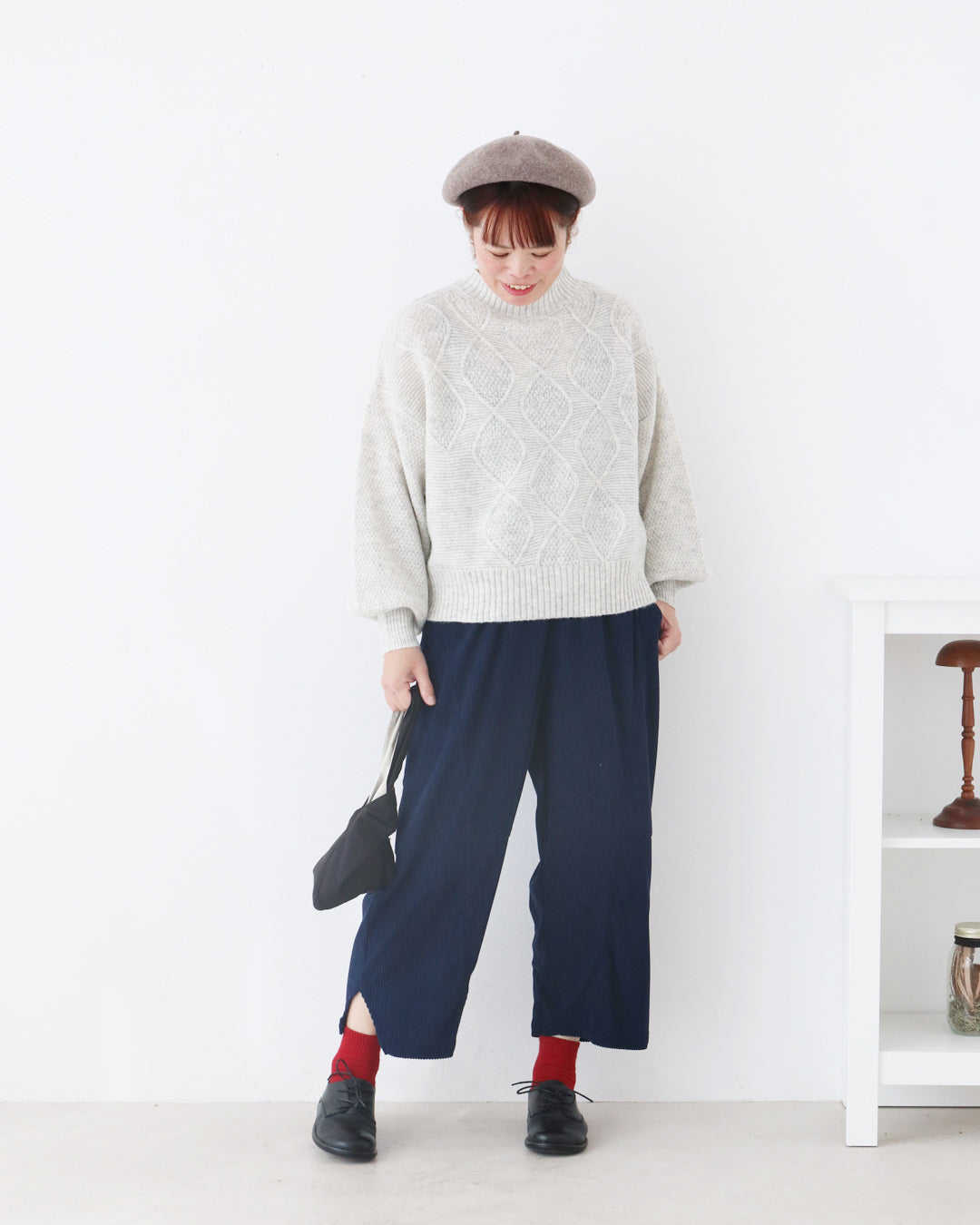 ふっくらとしたダイヤ柄の編み目が目を引く、表情豊かなニット。