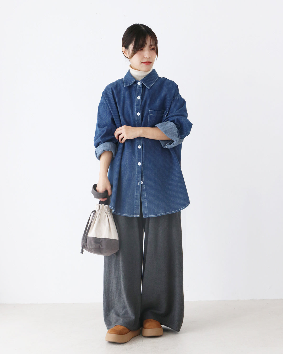 デニムシャツを主役に、落ち感のあるニットワイドパンツを合わせたコーデ。
