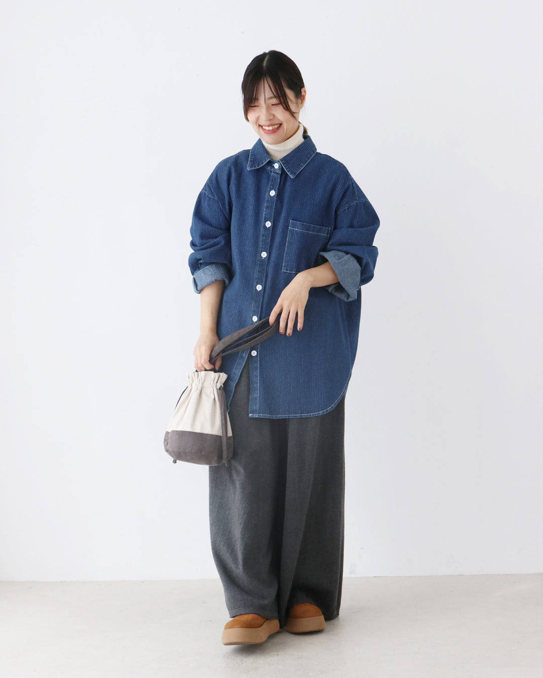 小物はやさしい色合いでまとめ、気負わず着られる大人のカジュアルスタイルに仕上げました。