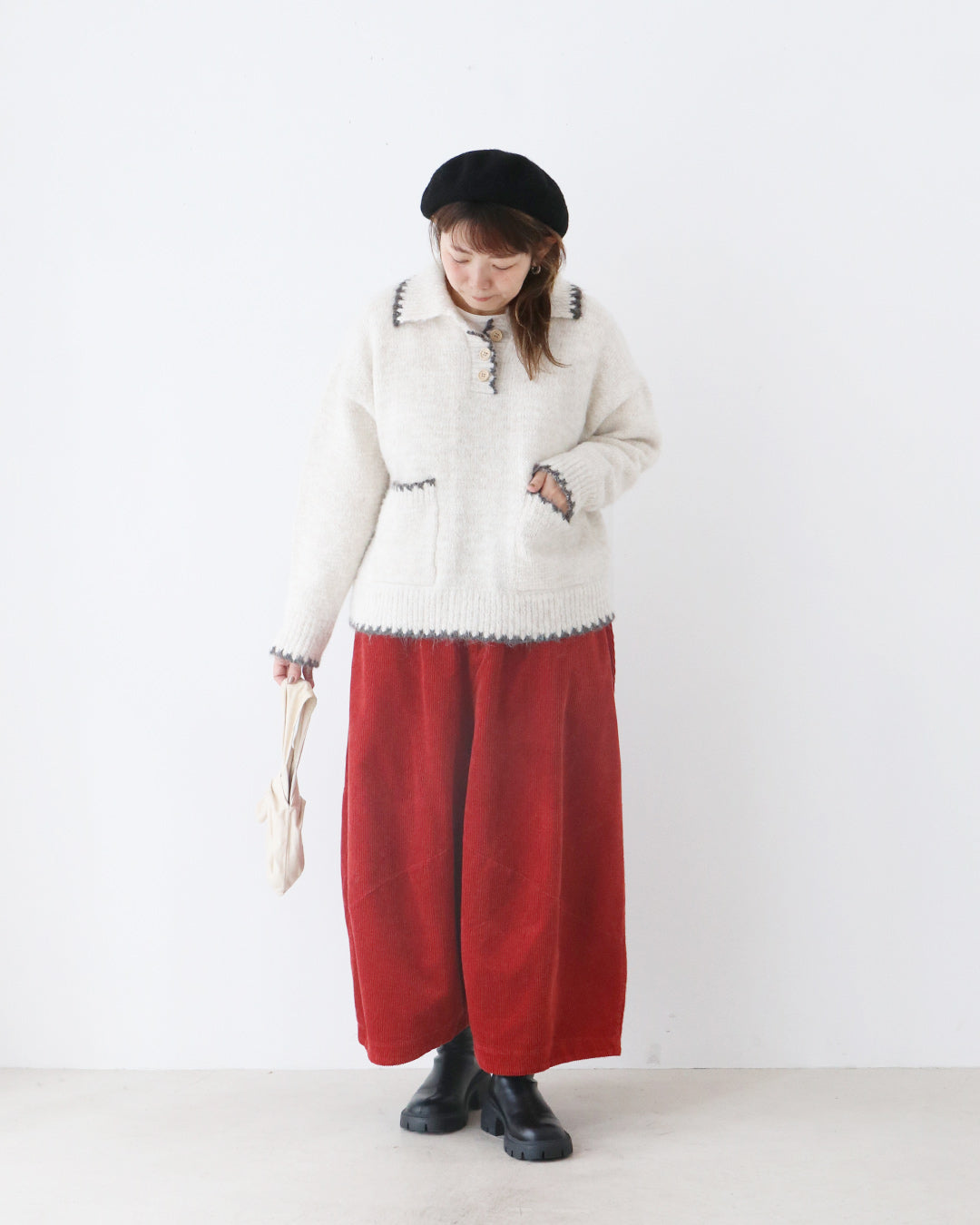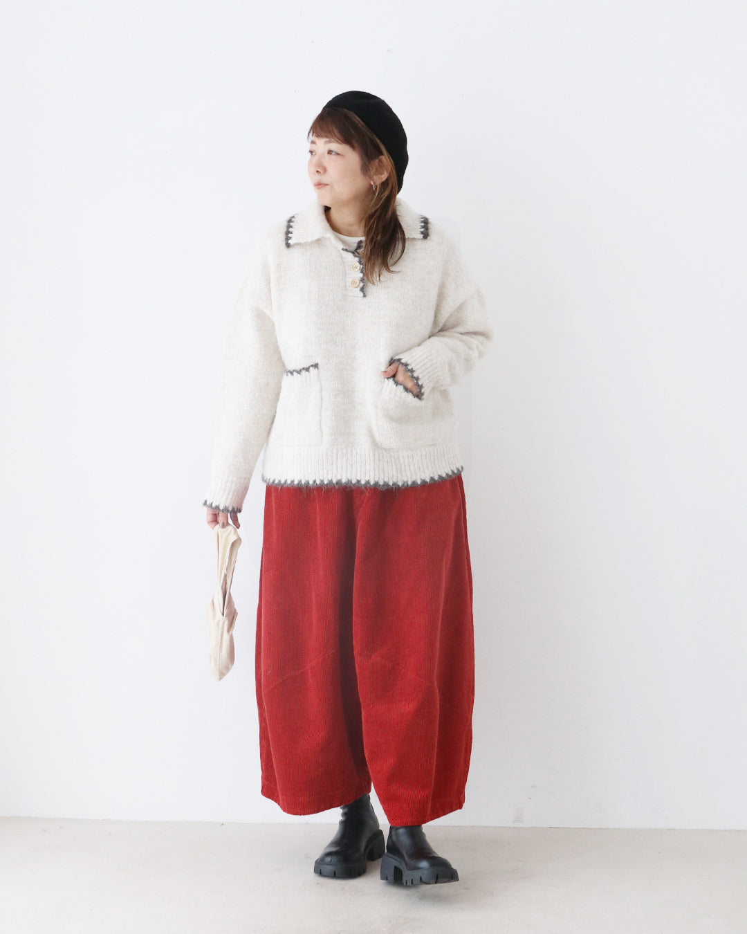 襟元のステッチが目を引く白ニットを主役に、鮮やかな赤のワイドパンツを合わせた存在感のあるスタイル。