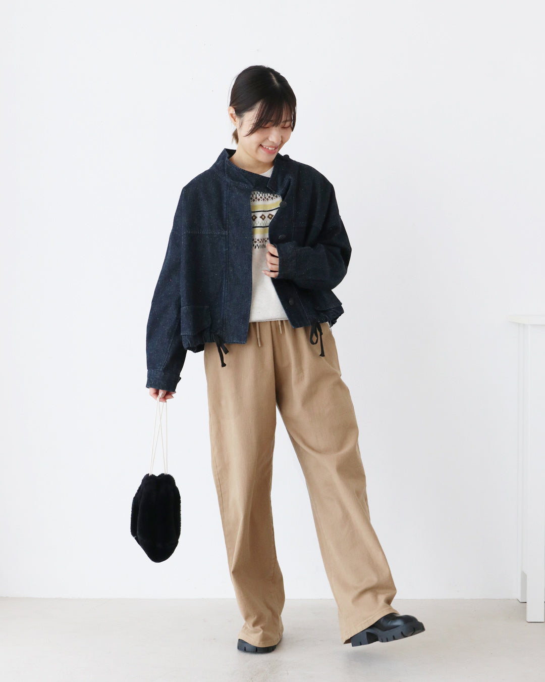 ゆったりとしたシルエットのデニムジャケットは、裾のドロストでシルエットを調整可能◎。